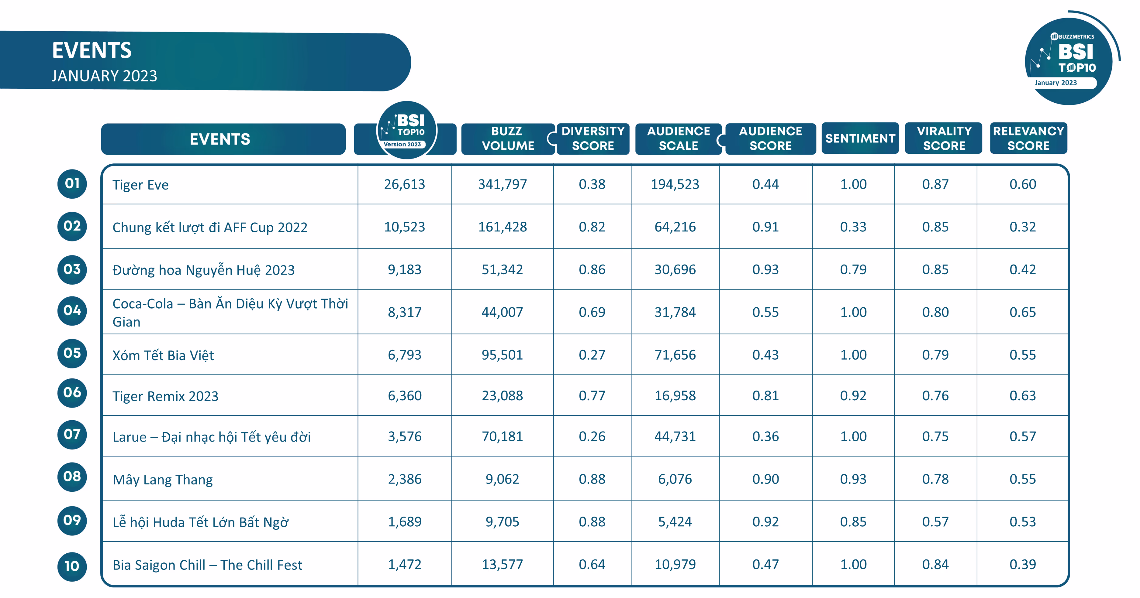 Ngoài các sự kiện được nói trên: Tiger Eve, Xóm Tết Bia Việt, Tiger Remix 2023 được diễn ra ở Cần Thơ thì bảng xếp hạng BSI Top10 Events tháng 01/2023 còn ghi nhận những sự kiện chào đón năm mới từ các thương hiệu như Đại nhạc hội Tết yêu đời của Larue, Huda Tết Lớn Bất Ngờ, The Chill Fest của Bia Saigon Chill. Ngoài ra, còn có những sự kiện thu hút sự chú ý của cộng đồng mạng như Chung kết lượt đi AFF Cup 2022, Đường hoa Nguyễn Huệ 2023, Coca - Cola - Bàn Ăn Diệu Kỳ Vượt Thời Gian và Mây Lang Thang.