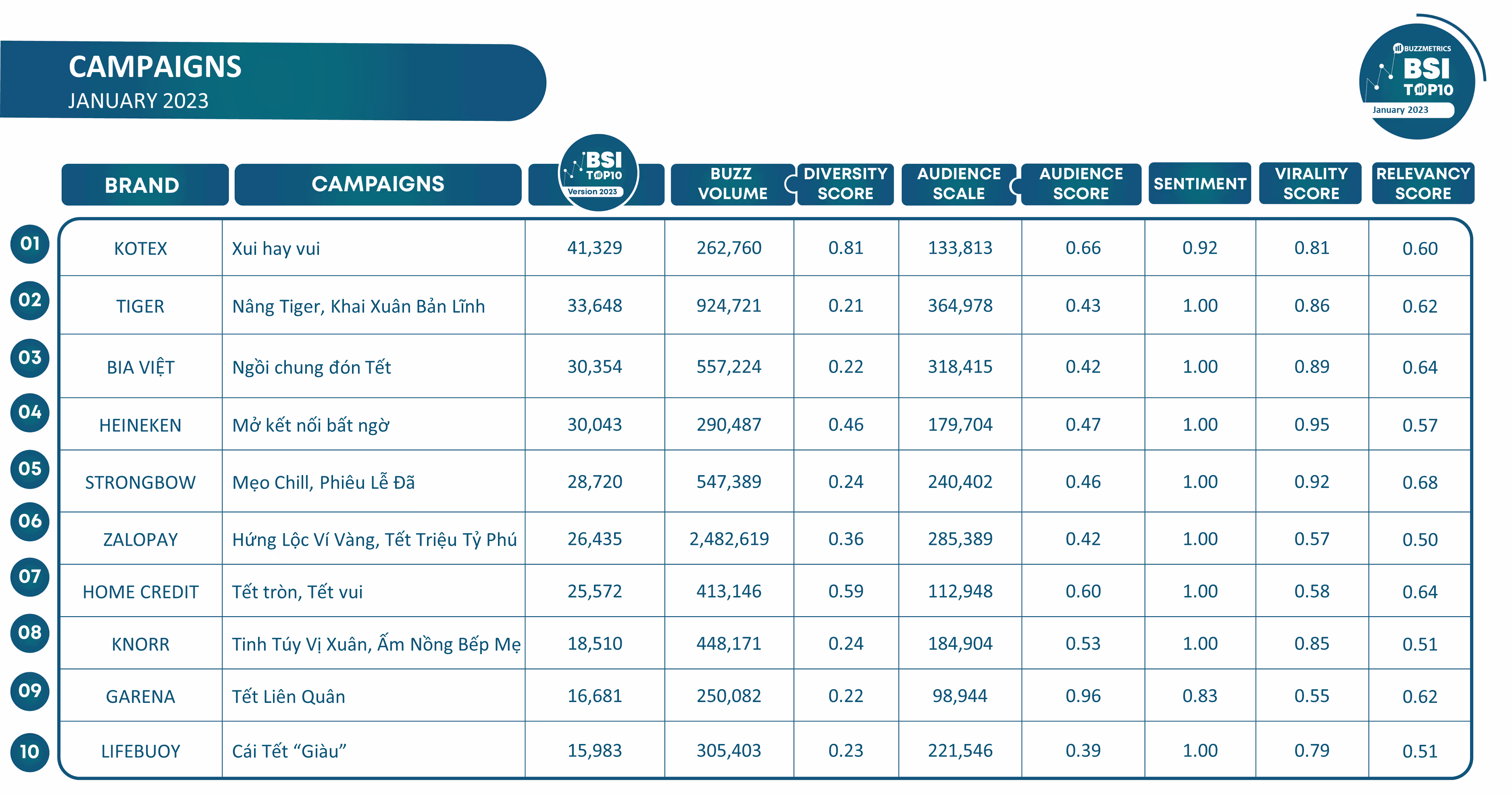 - ZaloPay - Hứng Lộc Ví Vàng, Tết Triệu Tỷ Phú: Thúc đẩy mọi người thanh toán qua app ZaloPay là mục tiêu mà thương hiệu hướng đến trong dịp Tết này thông qua chiến dịch “Hứng Lộc Ví Vàng, Tết Triệu Tỷ Phú”. Nhờ sự hưởng ứng nhiệt tình cộng động mạng cho gamification trên app “Tết triệu tỷ phú” và bày tỏ muốn nhận lì xì online trên trang của KOLs, Tiktoker, Social Pages, chiến dịch đã sở hữu được Buzz Volume cao nhất bảng xếp hạng BSI Top10 Campaigns tháng 01/2023. Bên cạnh đó, ZaloPay còn khiến nhiều người chú ý hơn khi ra mắt video ngắn “Chị Em Cà Khịa - CÁI NẾT HỨNG TẾT” được kết hợp với Huỳnh Lập và Chị Ca Nô. Với nội dung hài hước, video nhanh chóng được người dùng chia sẻ trên các nền tảng xã hội và giúp chiến dịch mang về chỉ số lan truyền khá cao.