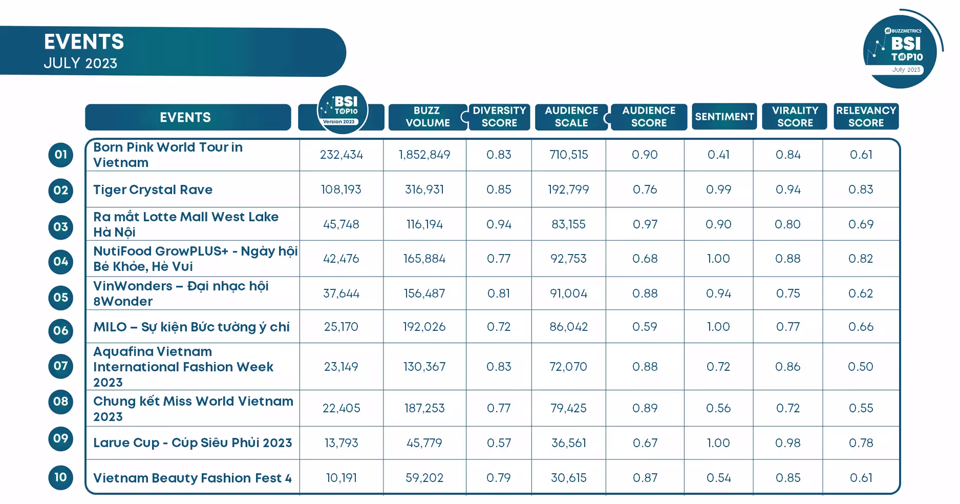 Ngoài các sân chơi thú vị vào dịp hè đã được kể đến gồm Tiger Crystal Rave, Ngày Hội Bé Khỏe, Hè Vui được tổ chức bởi NutiFood GrowPLUS+, Đại nhạc hội 8Wonder tại VinWonders Nha Trang, sự kiện Bức tường ý chí của MILO thì BSI Top10 Events tháng 07/2023 còn ghi nhận các sự kiện có sức ảnh hưởng như Born Pink World Tour in Vietnam, Ra mắt Lotte Mall West Lake Hà Nội, Larue Cup - Cúp Siêu Phủi 2023. Bên cạnh đó, những show về thời trang, sắc đẹp cũng nhận được sự theo dõi là Aquafina Vietnam International Fashion Week 2023, Chung kết Miss World Vietnam 2023 và Vietnam Beauty Fashion Fest 4.