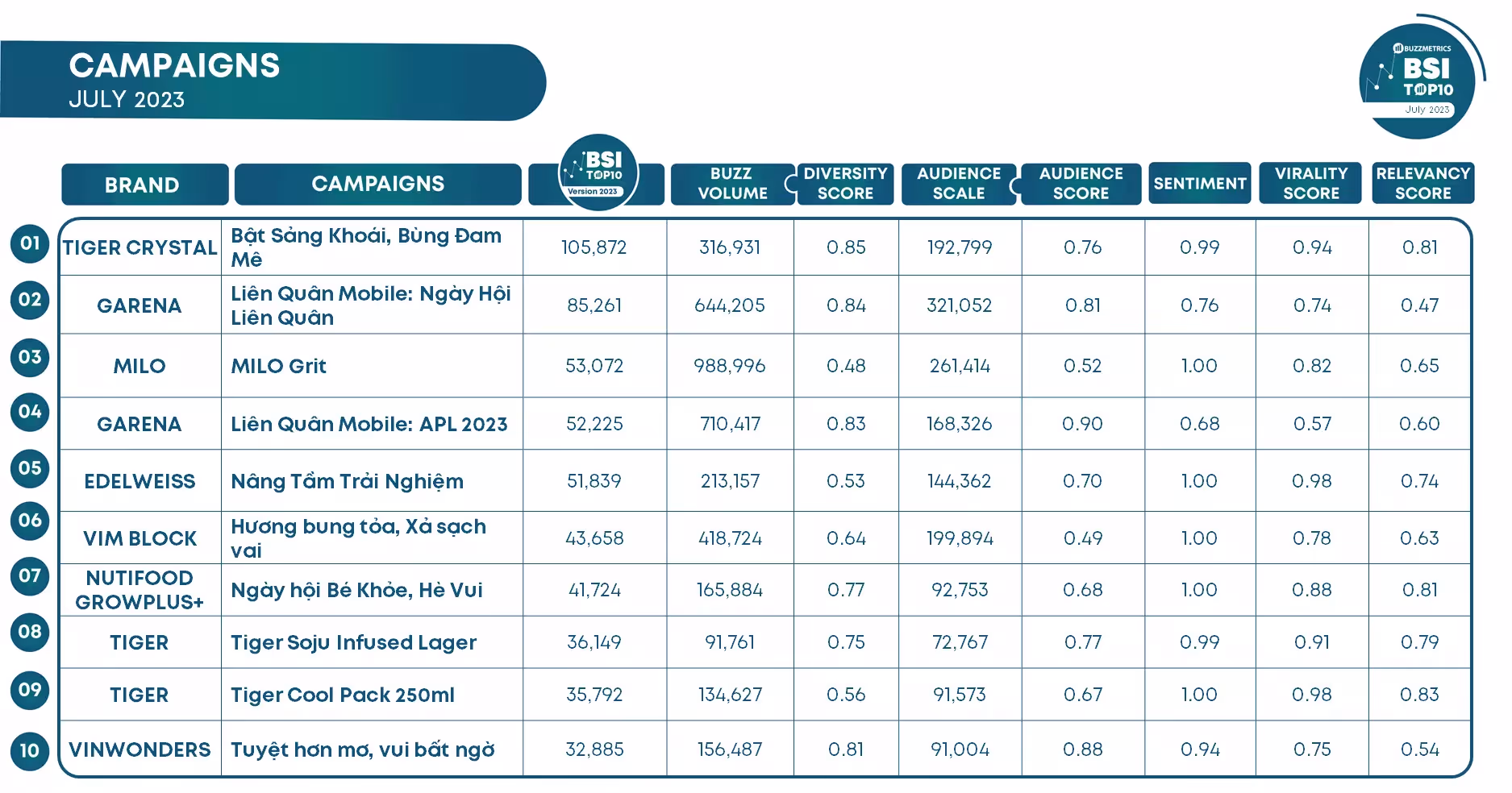 - Tiger Crystal - Bật Sảng Khoái, Bùng Đam Mê: Với thông điệp “Bật Sảng Khoái, Bùng Đam Mê”, Tiger một lần nữa gây ấn tượng với cộng đồng mạng qua sự kiện “Tiger Crystal Rave 2.0”. Đây cũng là hoạt động chính mang về nguồn thảo luận cho chiến dịch khi sự kiện được tổ chức khác so với các đợt trước là về chủ đề “Water EDM”. Đồng thời, các thông tin về quy mô sự kiện như âm thanh ánh sáng, hệ thống nước, sân khấu… trên Community Pages đã đã làm cư dân mạng bày tỏ thích thú và tag bạn bè rủ đi. Do đó, “Tiger Crystal Rave” diễn ra tại Vũng Tàu (22/7) còn ghi danh thêm vào bảng xếp hạng BSI Top10 Events tháng 07/2023.