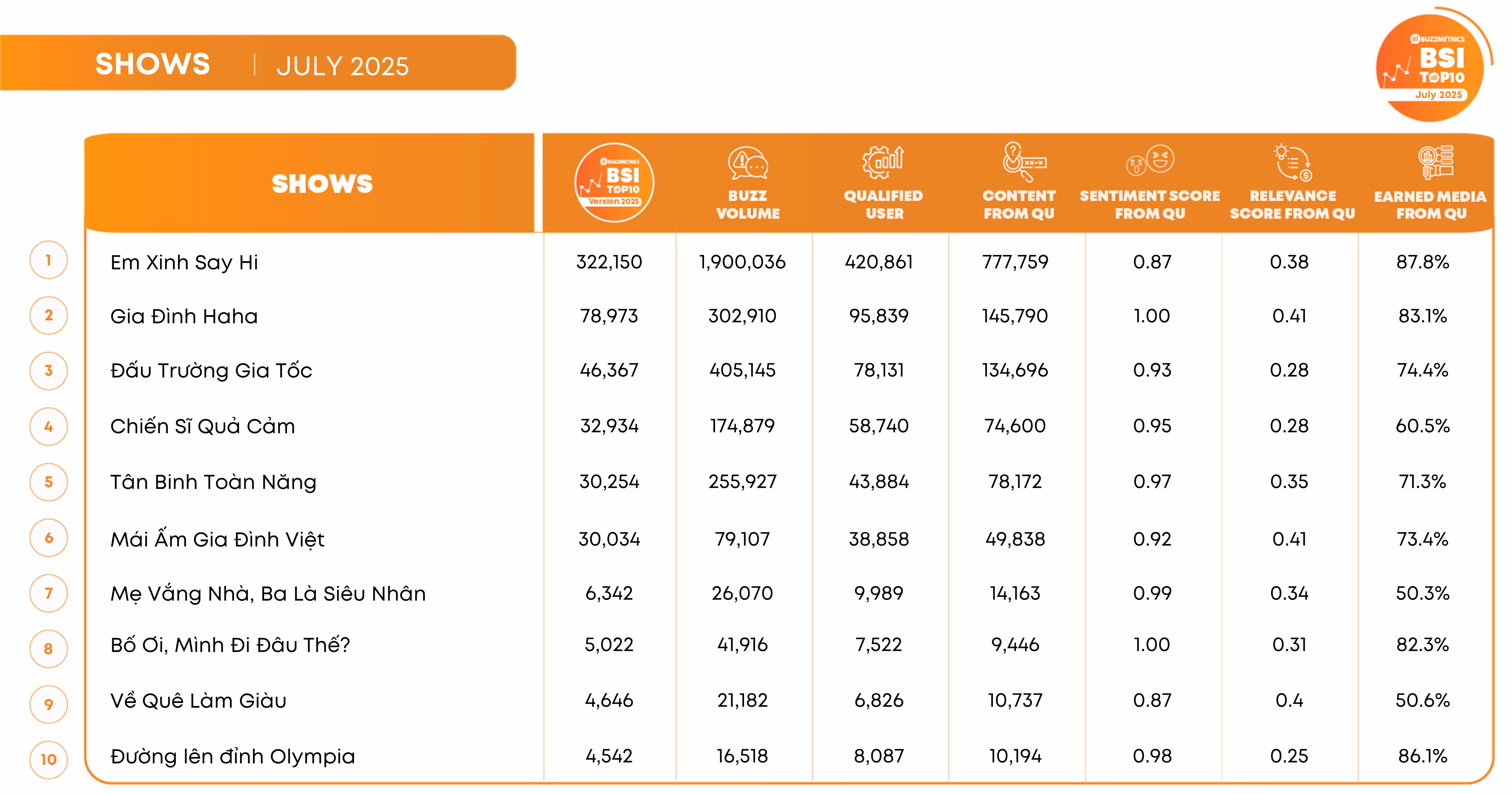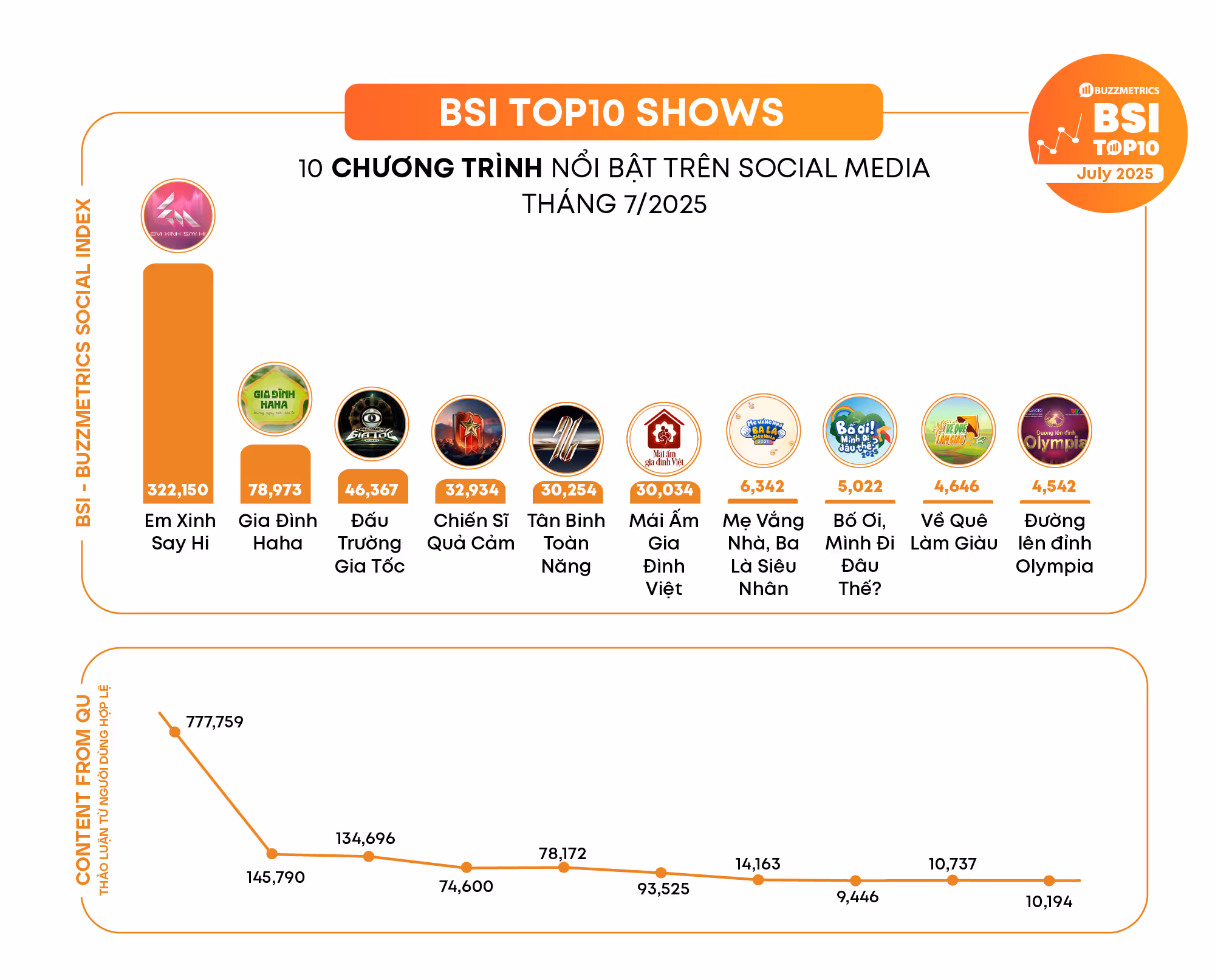 BXH BSI Top10 Shows tháng này tiếp tục chứng kiến sự áp đảo của Em Xinh Say Hi ở vị trí số 1. Gia Đình Haha nhảy hai bậc lên vị trí thứ hai, cho thấy sức hút của một chương trình chữa lành. Đường Lên Đỉnh Olympia quay trở lại BXH sau một tháng vắng mặt. Các chương trình còn lại đều là những gương mặt cũ của tháng trước: Đấu Trường Gia Tốc; Chiến Sĩ Quả Cảm; Tân Binh Toàn Năng; Mái Ấm Gia Đình Việt; Mẹ Vắng Nhà Ba Là Siêu Nhân; Bố Ơi, Mình Đi Đâu Thế?; Về Quê Làm Giàu.