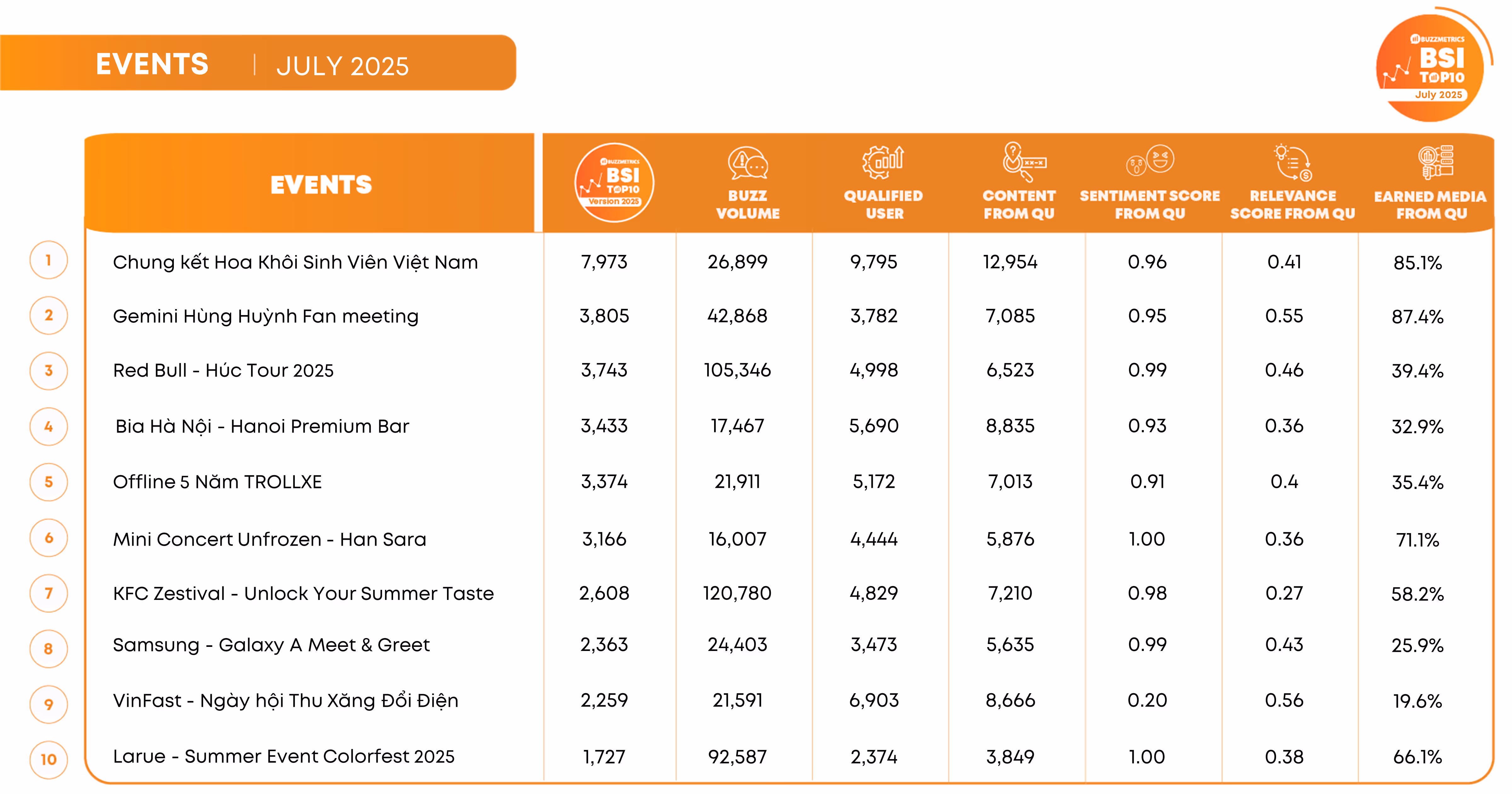 Ngoài hai sự kiện Húc Tour của Red Bull và Meet & Greet của Samsung, BXH BSI Top10 Events còn vinh danh chung kết Hoa Khôi Sinh Viên Việt Nam ở vị trí đầu tiên. Bên cạnh đó là Fan Meeting của ca sĩ Hùng Huỳnh Gemini, Offline 5 Năm TROLLXE, Hanoi Premium Bar của Bia Hà Nội, mini concert Unfrozen của Han Sara, KFC Zestival: Unlock Your Summer Taste của KFC, Ngày hội Thu Xăng Đổi Điện của Vinfast, Summer Event Colorfest của Larue.