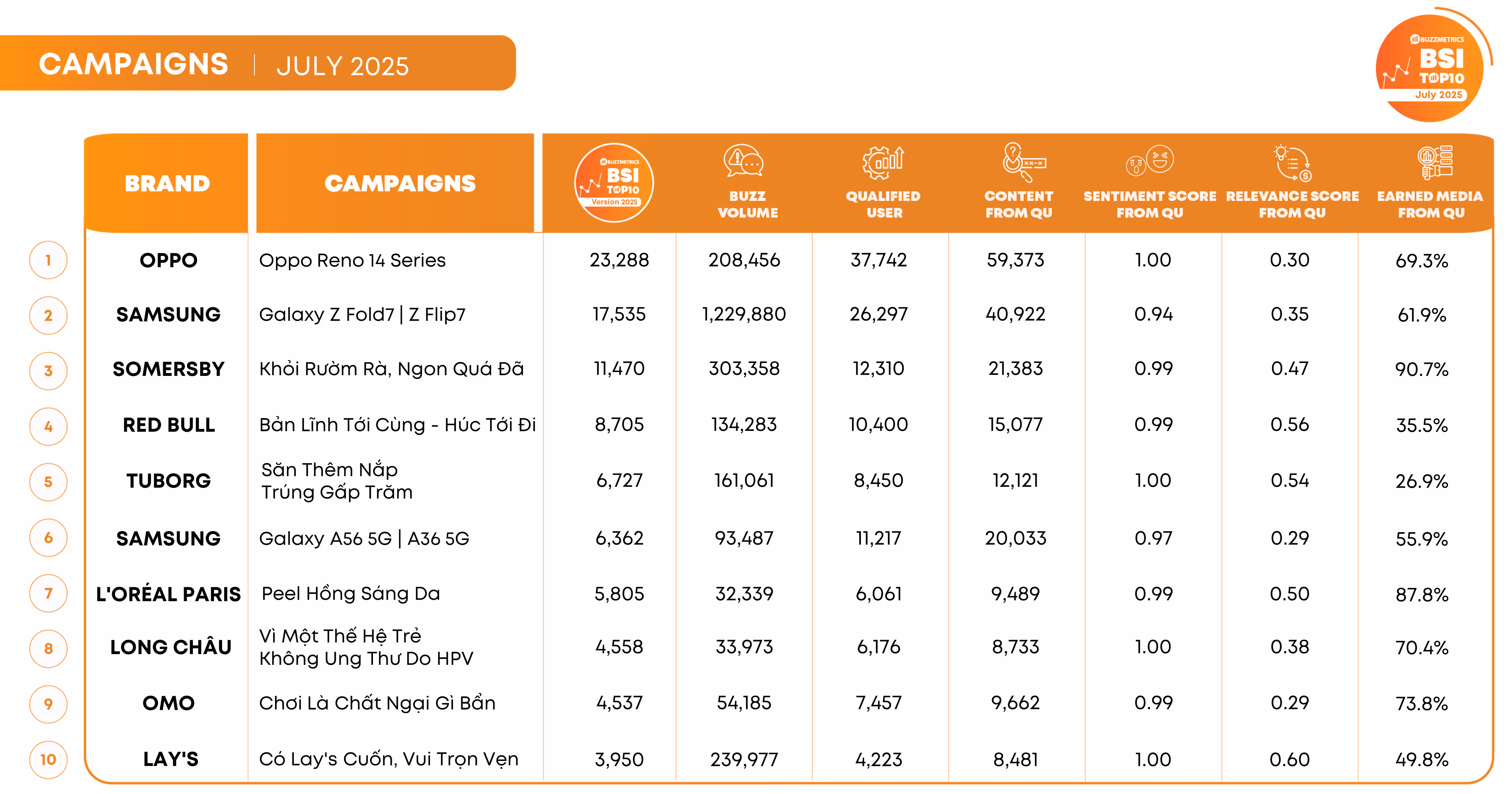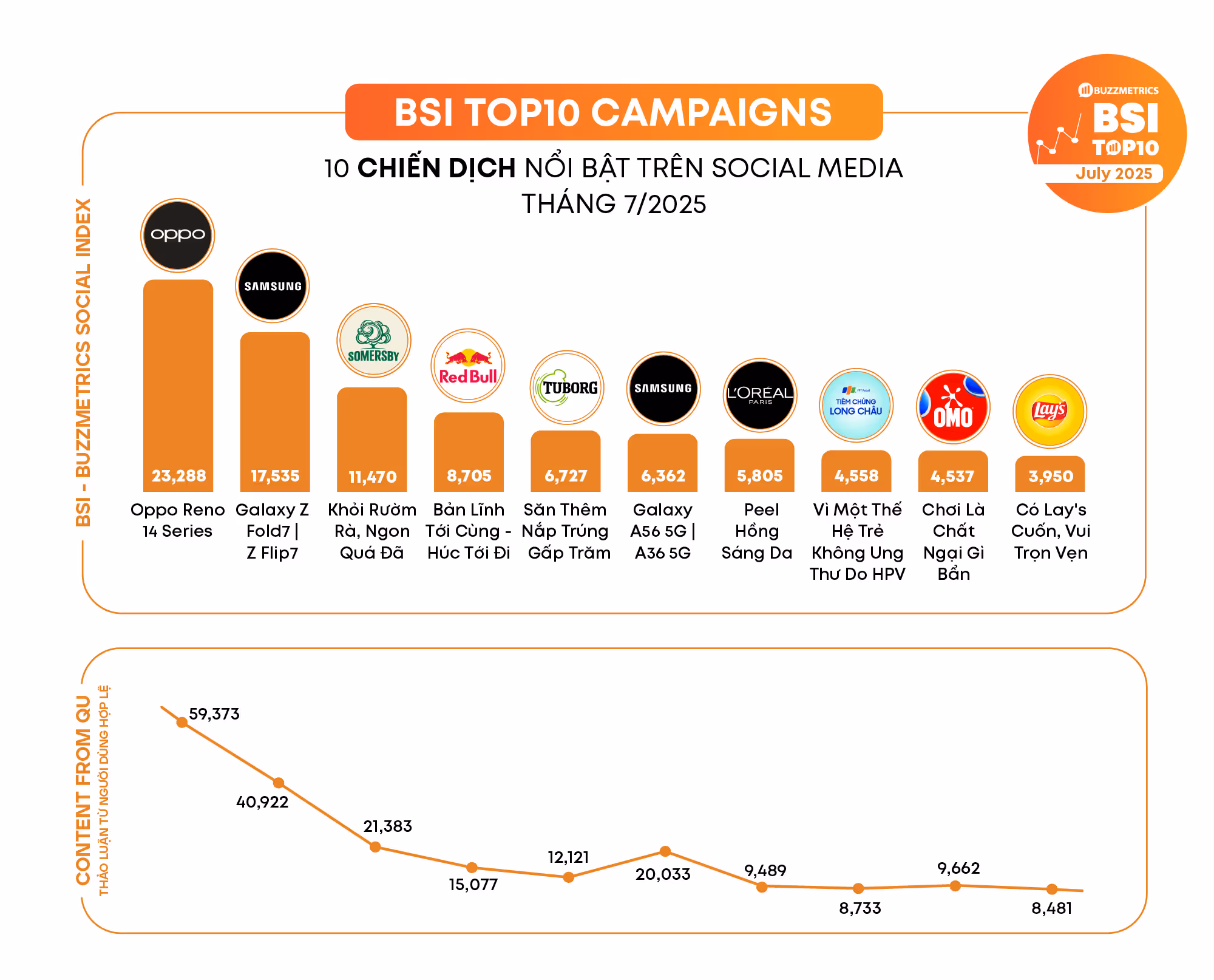 OPPO Reno14 Series vươn lên vị trí dẫn đầu, với chiến dịch Galaxy Fold7 | Z Flip7 ở ngay phía sau. Somersby với chiến dịch Khỏi Rườm Rà, Ngon Quá Đã và Tuborg với chiến dịch Săn Thêm Nắp, Trúng Gấp Trăm đã lần đầu đặt chân vào BXH BSI Top10 Campaigns. Các chiến dịch Vì Một Thế Hệ Trẻ Không Ung Thư Do HPV của Long Châu; Bản lĩnh tới cùng - Húc tới đi của Red Bull; Galaxy A56 5G | A36 5G trụ vững trong BXH tháng này. Bên cạnh đó là các chiến dịch Peel Hồng Sáng Da của L’oreal Paris; Chơi Là Chất Ngại Gì Bẩn của OMO; Có Lay’s Cuốn, Vui Trọn Vẹn của Lay’s.