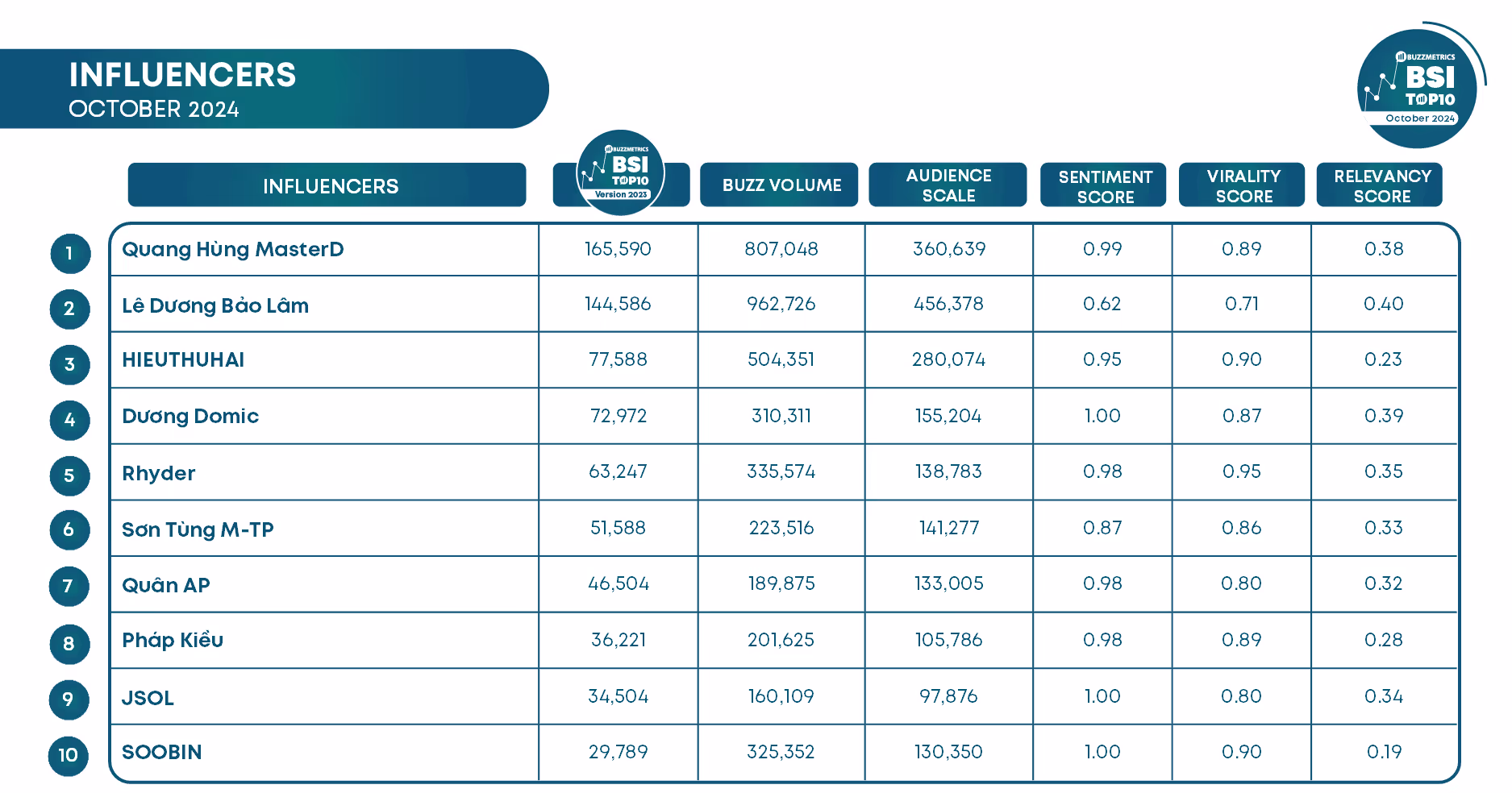 BXH BSI Top10 Influencers tháng 10/2024 chào đón sự trở lại của SOOBIN sau hơn 5 năm vắng bóng. Dù chương trình kết thúc đã lâu nhưng dàn Anh Trai Say Hi vẫn tiếp tục duy trì sức ảnh hưởng tích cực trên mạng xã hội, bao gồm: Quang Hùng MasterD, HIEUTHUHAI, Dương Domic, Rhyder, Quân AP, Pháp Kiều, JSOL. Sơn Tùng M-TP dù hoạt động không quá tích cực trên MXH nhưng vẫn ghi tên vào BXH. Bên cạnh đó, Lê Dương Bảo Lâm giữ chuỗi nhiều tháng liền xếp top 2.
