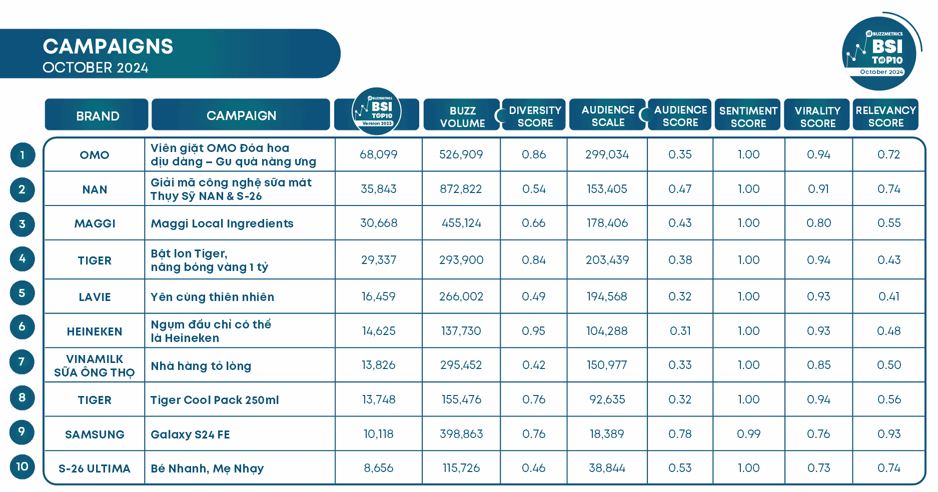 Góp mặt vào BXH BSI Top10 Campaigns tháng này có: Viên Giặt OMO Đóa hoa dịu dàng - Gu quà nàng ưng của OMO; Giải mã công nghệ sữa mát Thụy Sĩ NAN & S-26 của NAN; Maggi Local Ingredients của Maggi; Bật lon Tiger, nâng Bóng Vàng 1 Tỷ và Tiger Cool Pack 250ml của Tiger; Yên cùng thiên nhiên của Lavie; Ngụm đầu chỉ có thể là Heineken của Heineken; Nhà hàng tỏ lòng của Vinamilk Sữa Ông Thọ; Galaxy S24 FE của Samsung; Bé Nhanh, Mẹ Nhạy của S-26 Ultima.
