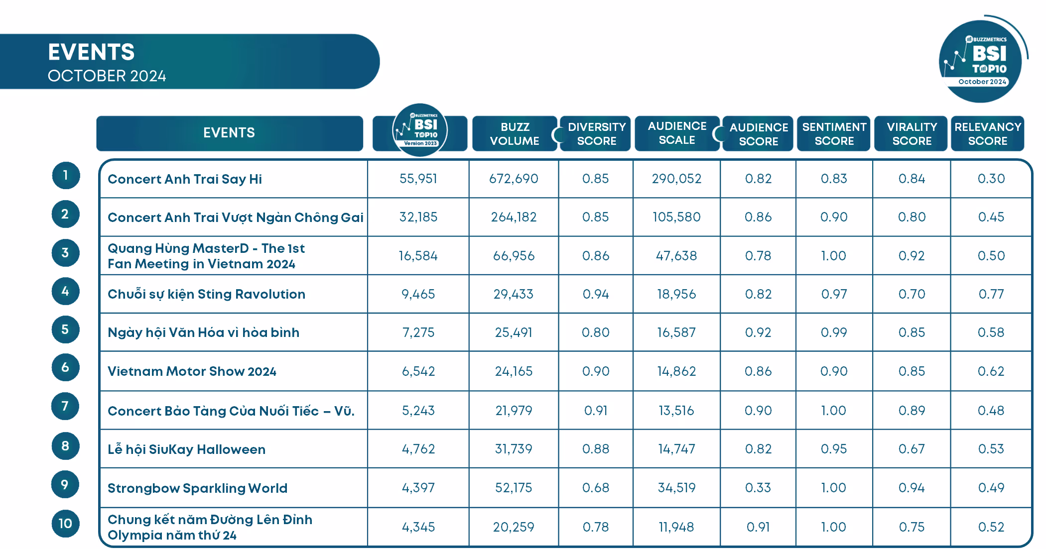 BXH BSI Top 10 Events tháng 10/2024 ghi nhận sự xuất hiện của các sự kiện nổi bật như: Concert Anh Trai Say Hi, Concert Anh Trai Vượt Ngàn Chông Gai, Quang Hùng MasterD - The 1st Fan Meeting in Vietnam, Chuỗi sự kiện Sting Ravolution, và Ngày hội Văn hoá vì hoà bình, Vietnam Motor Show 2024, Concert Bảo Tàng Của Nuối Tiếc - Vũ. cùng Chung kết năm Đường lên đỉnh Olympia năm thứ 24. Bên cạnh đó, những hoạt động như Lễ hội SiuKay Halloween, Strongbow Sparkling World cũng góp phần làm phong phú thêm bức tranh sự kiện tháng này.