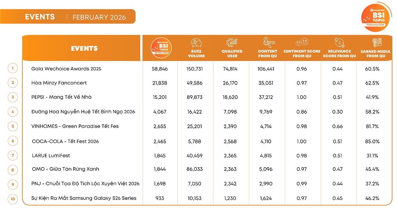 Gala WeChoice Awards trở thành sự kiện nổi bật nhất tháng 02/2026 với các chỉ số thảo luận vượt trội, trong khi xếp vị trí thứ hai là Fan Concert của Hòa Minzy. Bên cạnh đó, BXH tháng này ghi nhận sự góp mặt của hàng loạt sự kiện Tết sôi động, gồm có: Mang Tết Về Nhà của Pepsi, Larue Lumifest của Larue, Giữa Tán Rừng Xanh của OMO, Tết Fest của Coca-Cola, Green Paradise Tết Fest của VINHOMES, Chuỗi Tọa Độ Tích Lộc Xuyên Việt 2026 của PNJ, Đường hoa Nguyễn Huệ Tết Bính Ngọ. Sự kiện ra mắt Samsung Galaxy S26 xếp ở vị trí thứ 10.