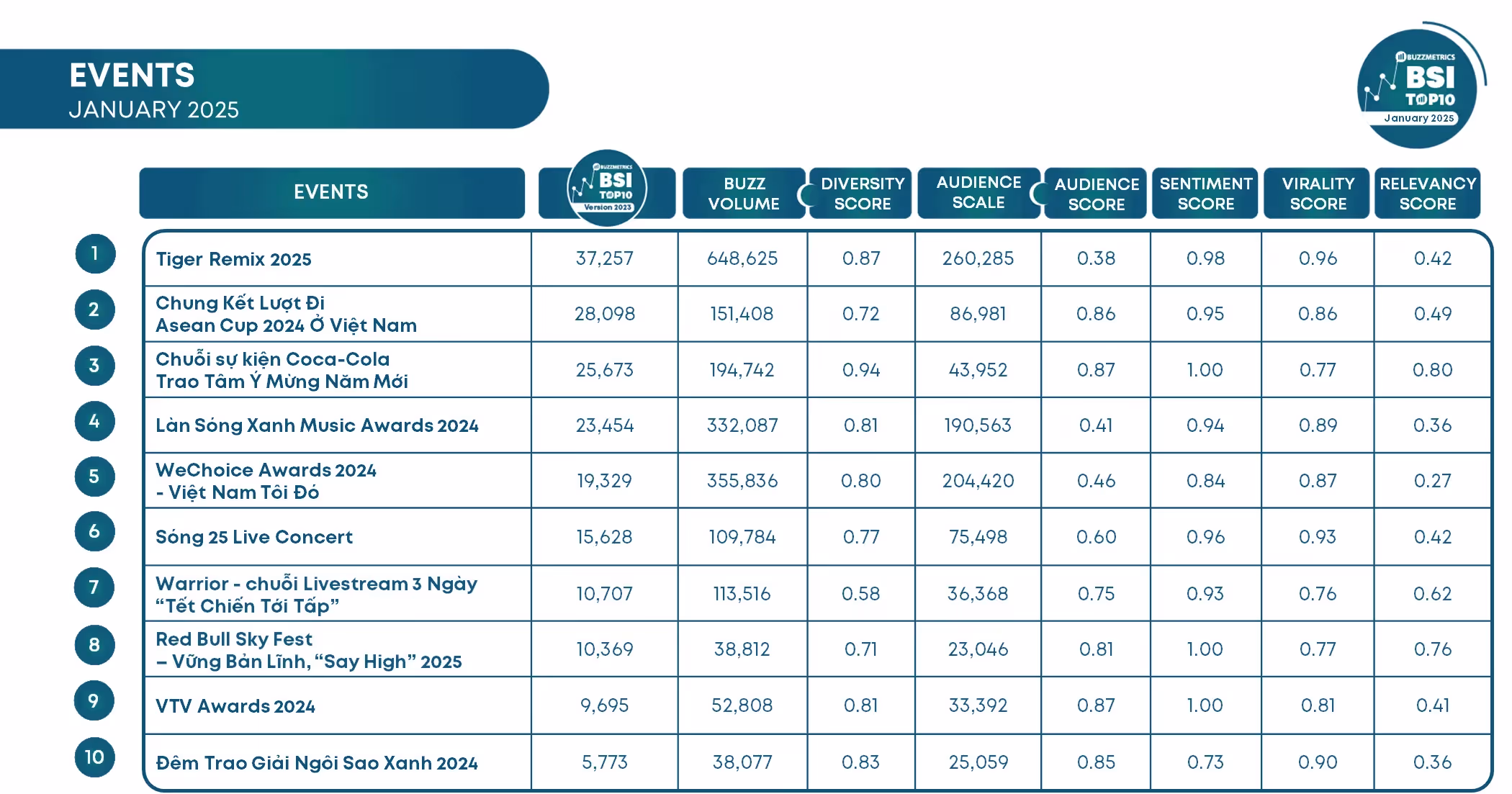 The BSI Top 10 Events rankings for January 2025 feature notable events such as Tiger Remix 2025, the first leg of the ASEAN Cup 2024 final, the Coca-Cola "Trao Tâm Ý Mừng Năm Mới" event series, Làn Sóng Xanh Music Awards 2024, WeChoice Awards 2024 – "Việt Nam Tôi Đó", Sóng 25 Live Concert, Warrior - 3-Day Livestream Series “Tết Chiến Tới Tấp”, Red Bull Sky Fest - "Vững Bản Lĩnh", "Say High" 2025, VTV Awards 2024, and Ngôi Sao Xanh 2024.