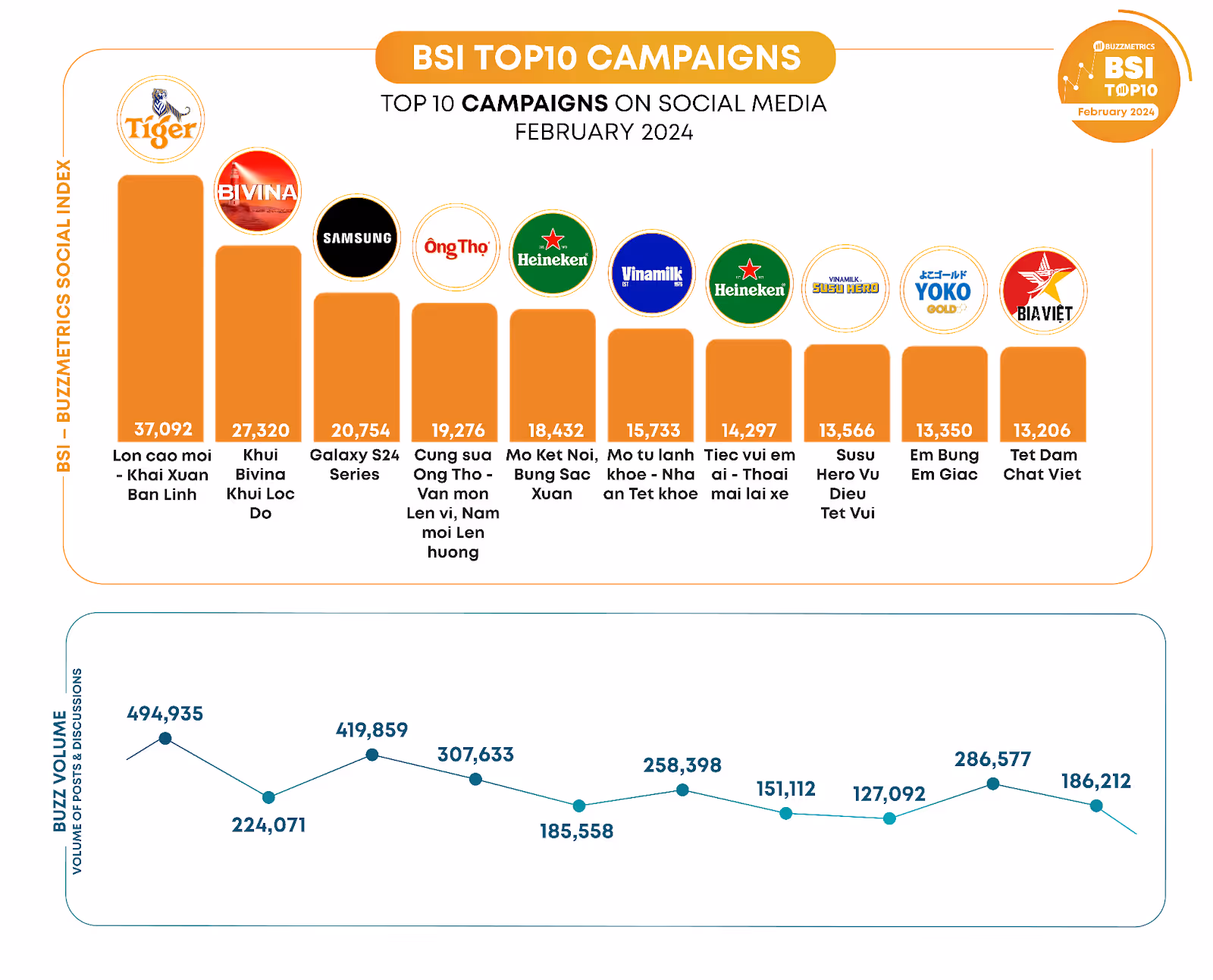 Tet campaigns continue to lead the BSI Top10 Campaigns for February, featuring several prominent initiatives such as Tiger's "Lon cao moi - Khai Xuan Ban Linh", Heineken's "Mo Ket Noi, Bung Sac Xuan", Vinamilk's "Mo tu lanh khoe - Nha an Tet khoe", Susu Hero's "Susu Hero Vu Dieu Tet Vui", Bia Viet’s "Tet Dam Chat Viet", Heineken 0.0’s "Tiec vui em ai - Thoai mai lai xe", Bivina's "Khui Bivina Khui Loc Do", "Cung sua Ong Tho - Van mon Len vi, Nam moi Len huong". Additionally, other notable campaigns include Samsung's "Galaxy S24 Series" and YOKOGOLD’s "Em Bung Em Giac".