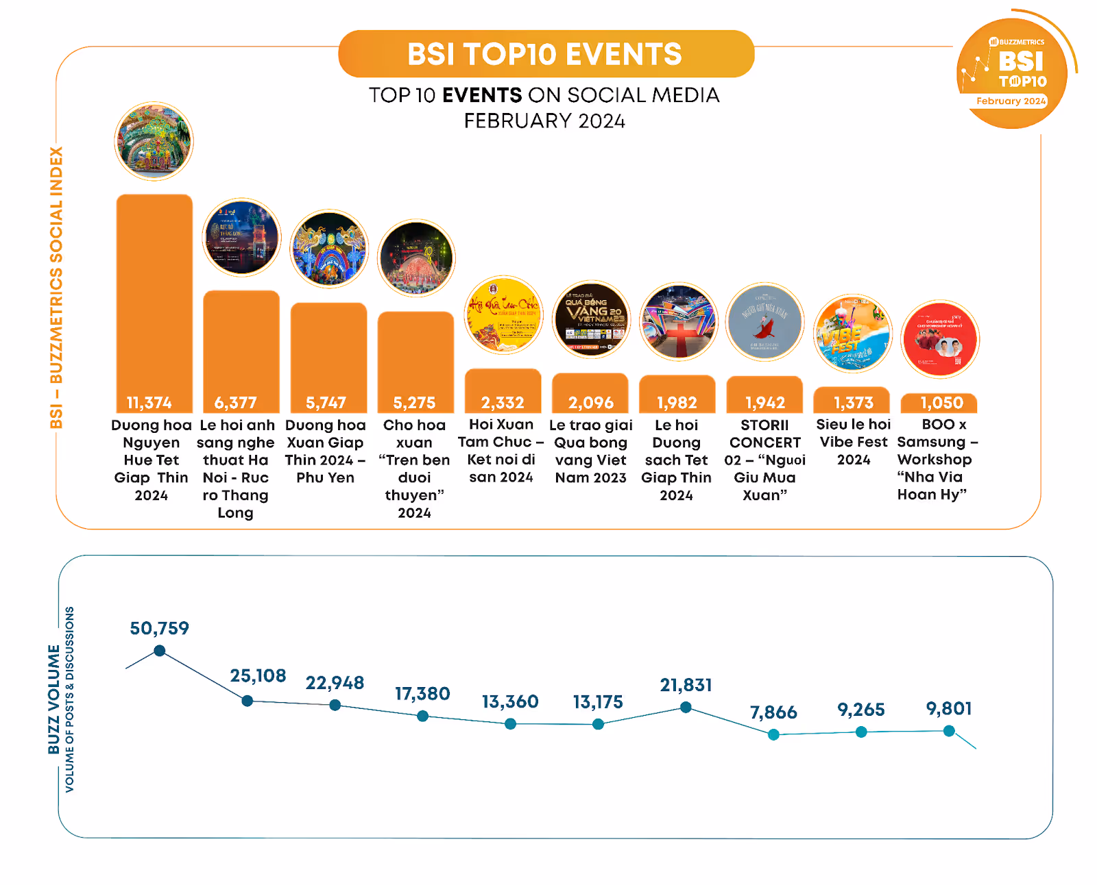 This month's ranking highlights the dominance of Tet festivals, including: Duong hoa Nguyen Hue Tet Giap Thin 2024, Le hoi anh sang nghe thuat Ha Noi - Ruc ro Thang Long, Duong hoa Tet cua Phu Yen, Cho hoa xuan “Tren ben duoi thuyen”, Hoi Xuan Tam Chuc, Le hoi Duong sach Tet Giap Thin 2024. STORII CONCERT 02 - “Nguoi Giu Mua Xuan” and Sieu le hoi Vibe Fest 2024 are major music-related events. Additionally, “Le trao giai Qua bong vang Viet Nam 2023” and the “Nha Via Hoan Hy” workshop, co-organized by BOO and Samsung, also drew significant attention from netizens.