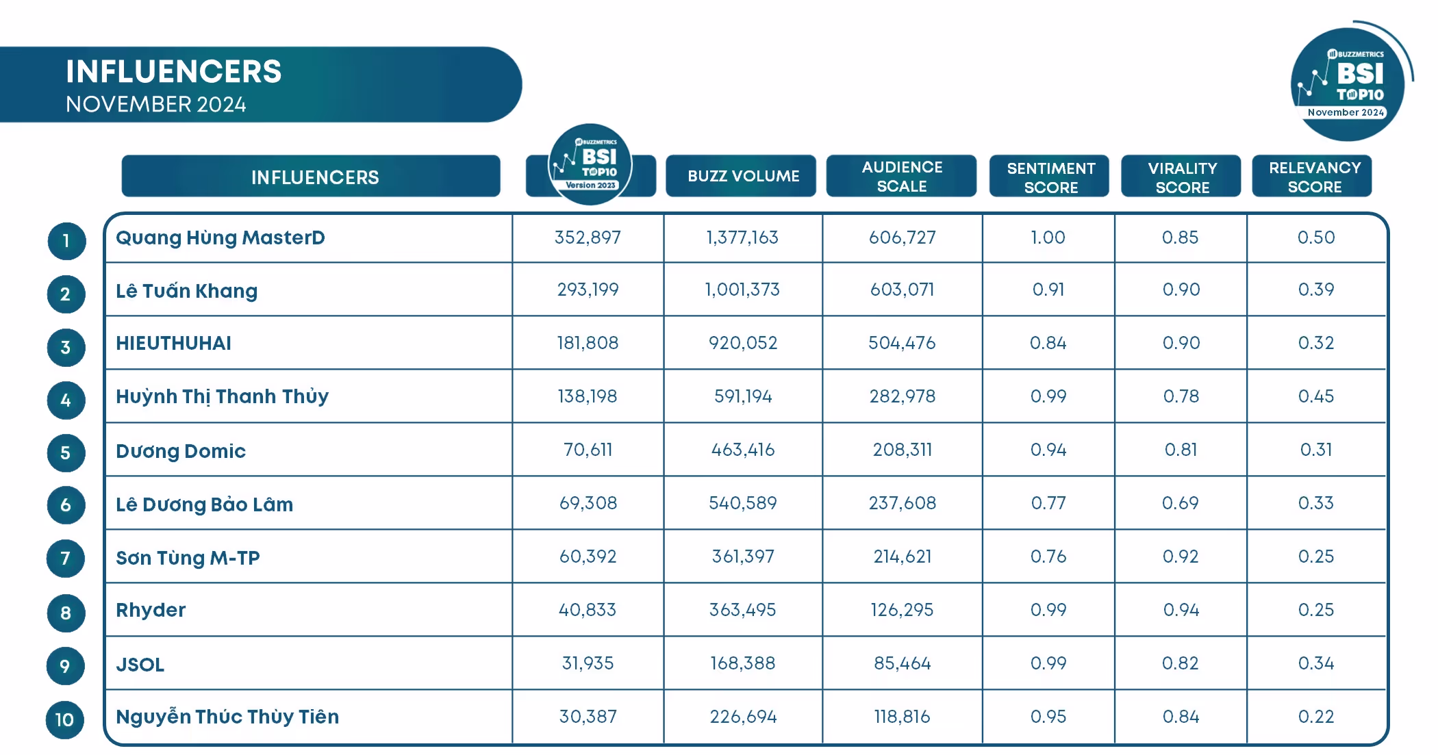 The BSI Top10 Influencers for November 2024 welcomed newcomers Lê Tuấn Khang and Miss International 2024 winner Huỳnh Thị Thanh Thủy. Nguyễn Thúc Thùy Tiên also returned after months of absence, alongside familiar names like Quang Hùng MasterD, HIEUTHUHAI, Dương Domic, Lê Dương Bảo Lâm, Sơn Tùng M-TP, Rhyder, and JSOL.