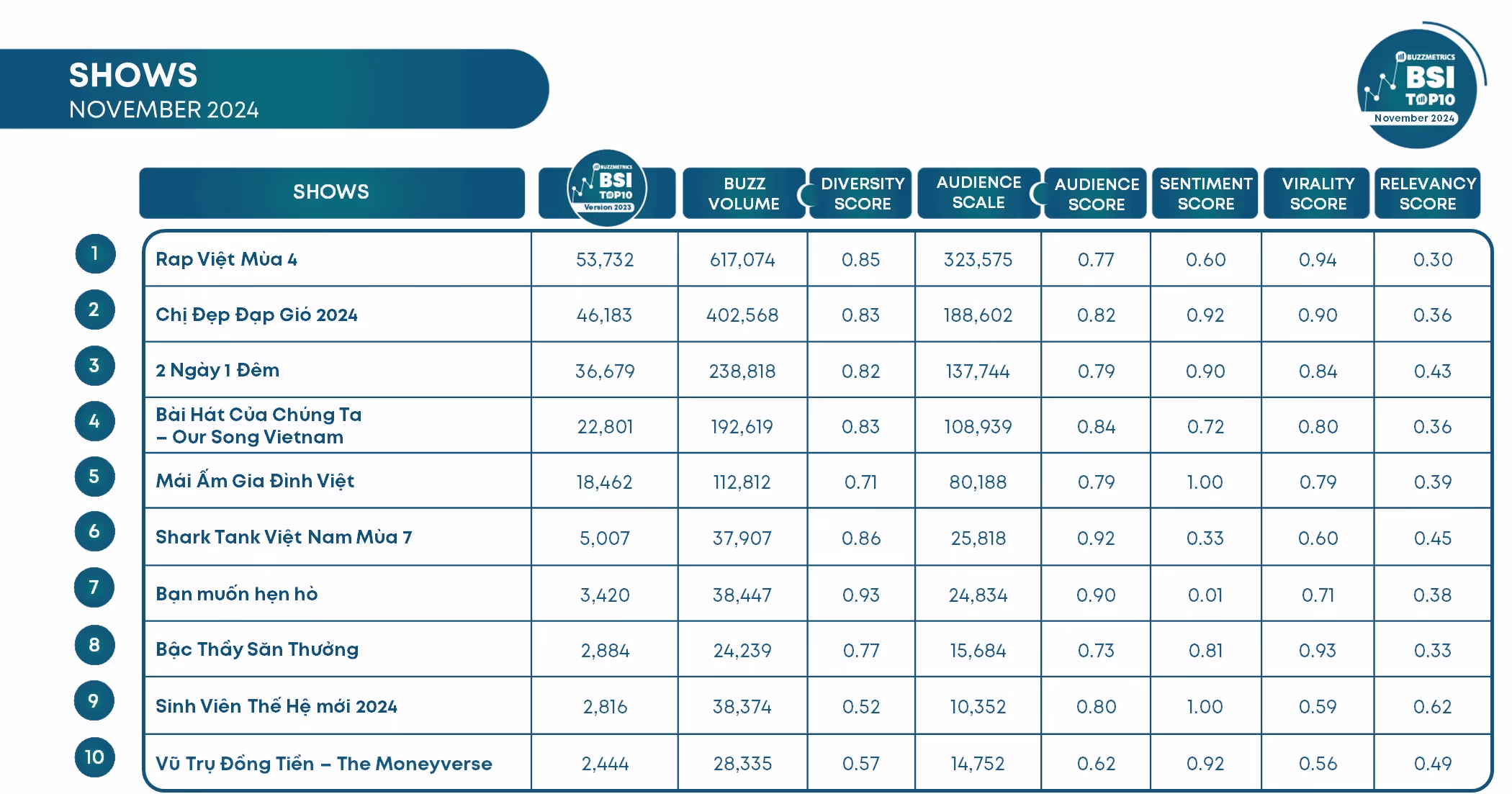 TOP 10 CHƯƠNG TRÌNH NỔI BẬT NHẤT TRÊN SOCIAL MEDIA THÁNG 11/2024