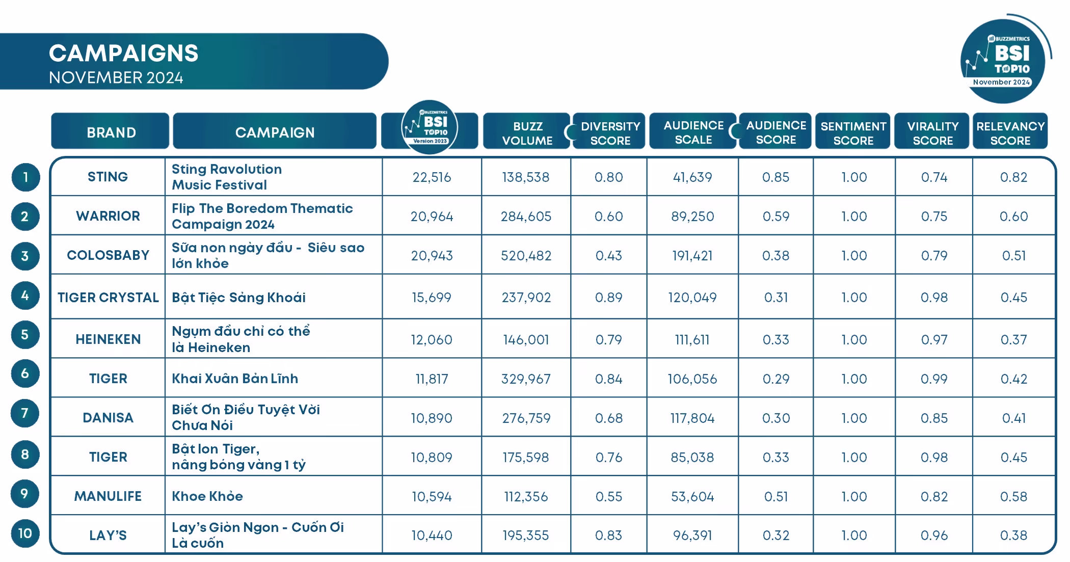 Featured in this month's BSI Top 10 Campaigns rankings are: Sting Ravolution Music Festival by Sting; Flip The Boredom Thematic Campaign 2024 by Warrior; First Days Colostrum - The Superstars of Strength by Colosbaby; Refreshing Party Blast by Tiger Crystal; The First Sip Can Only Be Heineken by Heineken; Bold Spring Kickoff by Tiger; Gratitude for the Wonderful Things Left Unsaid by Danisa; Pop Open a Tiger Can, Raise the Billion-VND Gold Ball by Tiger; Show Off Your Health by Manulife; Crispy & Delicious - Oh-So Irresistible Rolls by Lay’s.