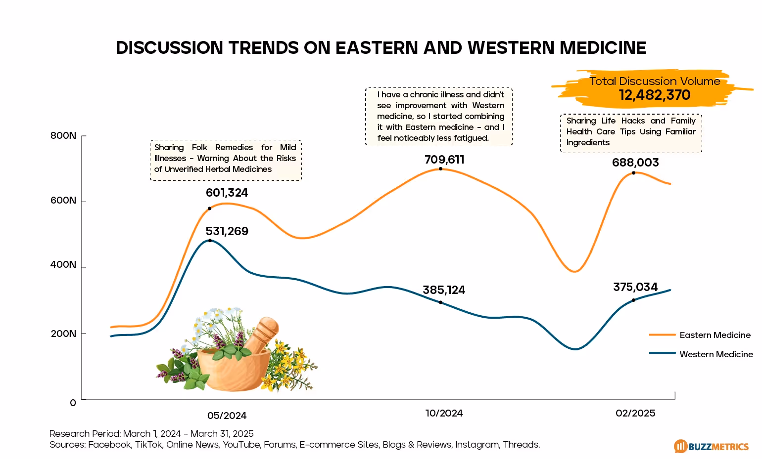 In the process of analyzing consumer behavior in the healthcare category, Buzzmetrics identified a clear shift, particularly reflected in discussions related to the pharmaceutical category. Specifically, when it comes to treatment methods involving medication, social media users make a clear distinction between Eastern and Western Medicine. Based on over a year of discussion data from March 2024 to February 2025, their usage behavior and areas of interest have shown significant differentiation and change.