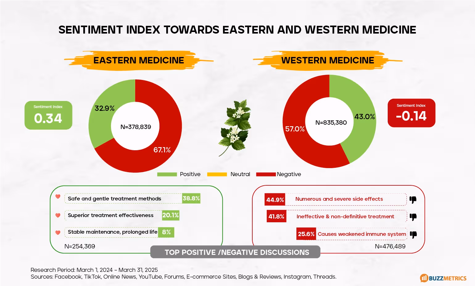 - For Eastern Medicine: Discussions are predominantly positive (67.1%), associated with keywords like “comfortable”, “no fatigue”, “peace of mind”, “healing from within” and “no concern about side effects”.