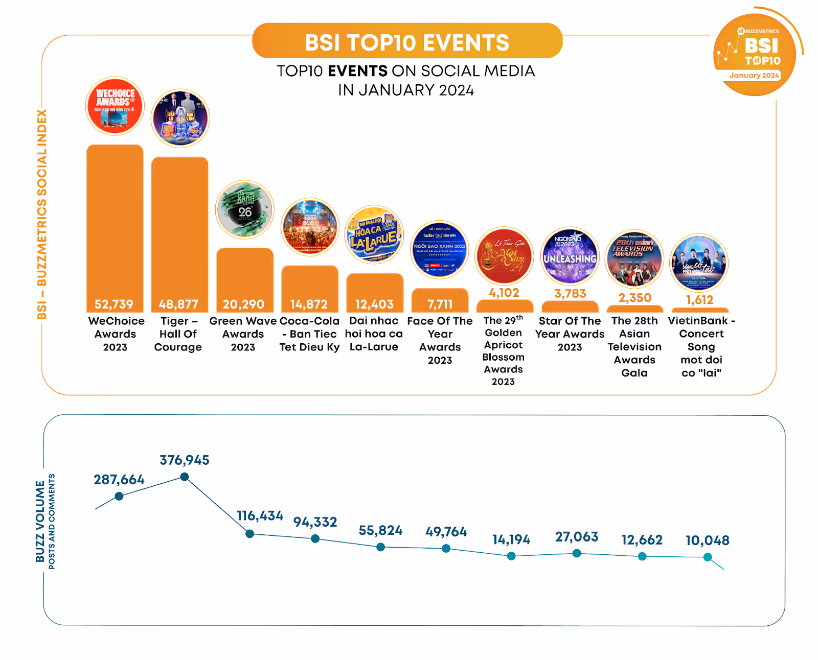 From 2018 to 2021, the BSI Top10 Events ranking for January typically recorded the presence of 1-2 award ceremonies. However, in 2022 and 2023, award ceremonies completely disappeared from the BSI Top10 Events rankings. By January 2024, the BSI Top10 Events ranking noted: For the first time, 6 out of the top 10 most influential events on social media were award ceremonies. Alongside familiar programs such as the WeChoice Awards, Green Wave Awards, and Golden Apricot Blossom Awards, there were three events making their debut appearances: Face Of The Year Awards 2023, the Star of the Year 2023 Awards Ceremony, and the 28th Asian Television Awards Gala.