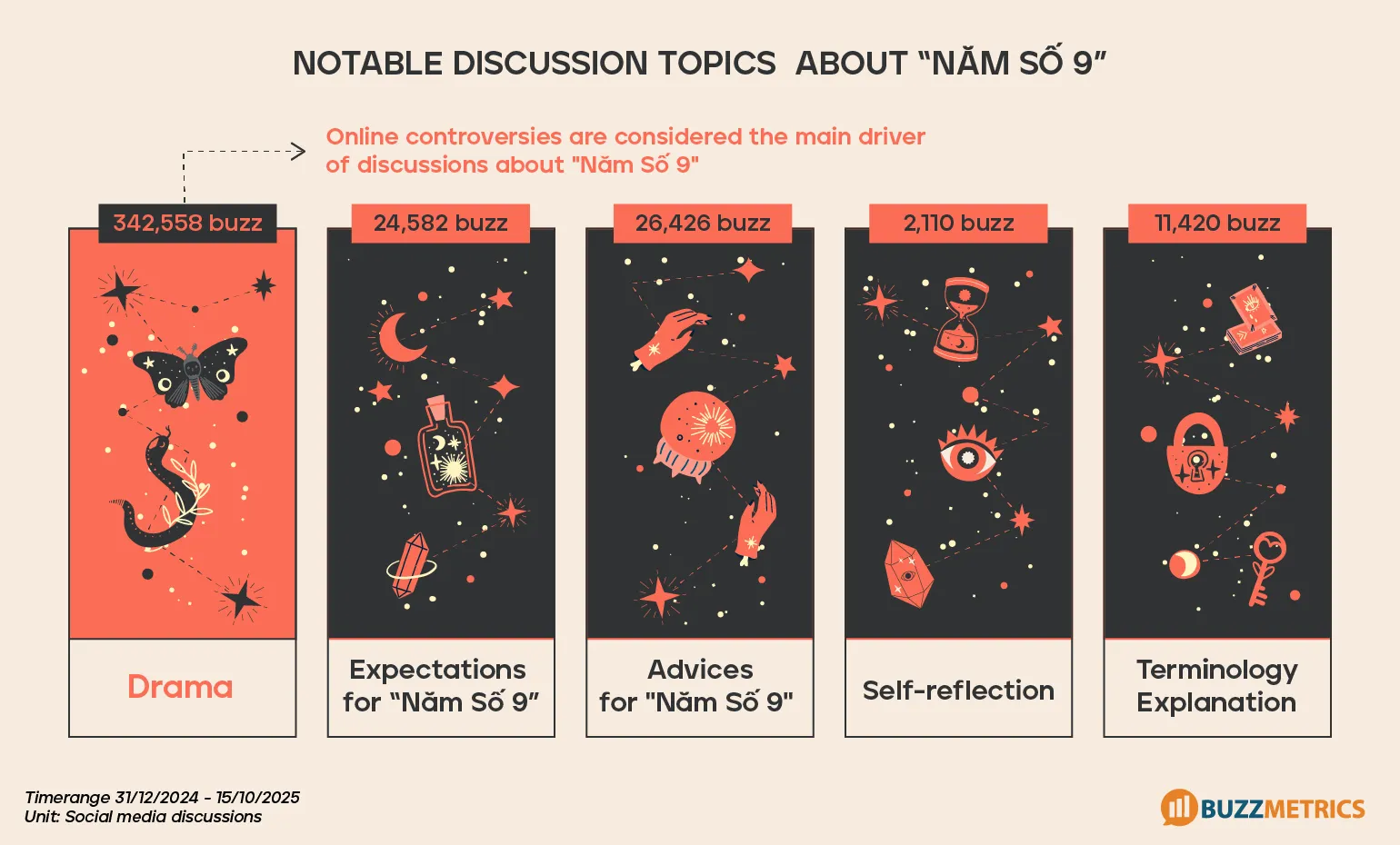 From the discussion timeline, Buzzmetrics identifies three major milestones for “Năm Số 9.” The first milestone was in January 2024, when users started sharing the concept of “Năm Số 9” while preparing for the new year. The second milestone came in July 2025, as people summed up the year’s first-half dramas. The next milestone was in September 2025, when social media was flooded with “reflection,” “cleansing,” and “closure” posts. Many users interpreted September as the symbolic end of “Năm Số 9.” Between these milestones, discussions were kept alive mainly by ongoing online dramas.