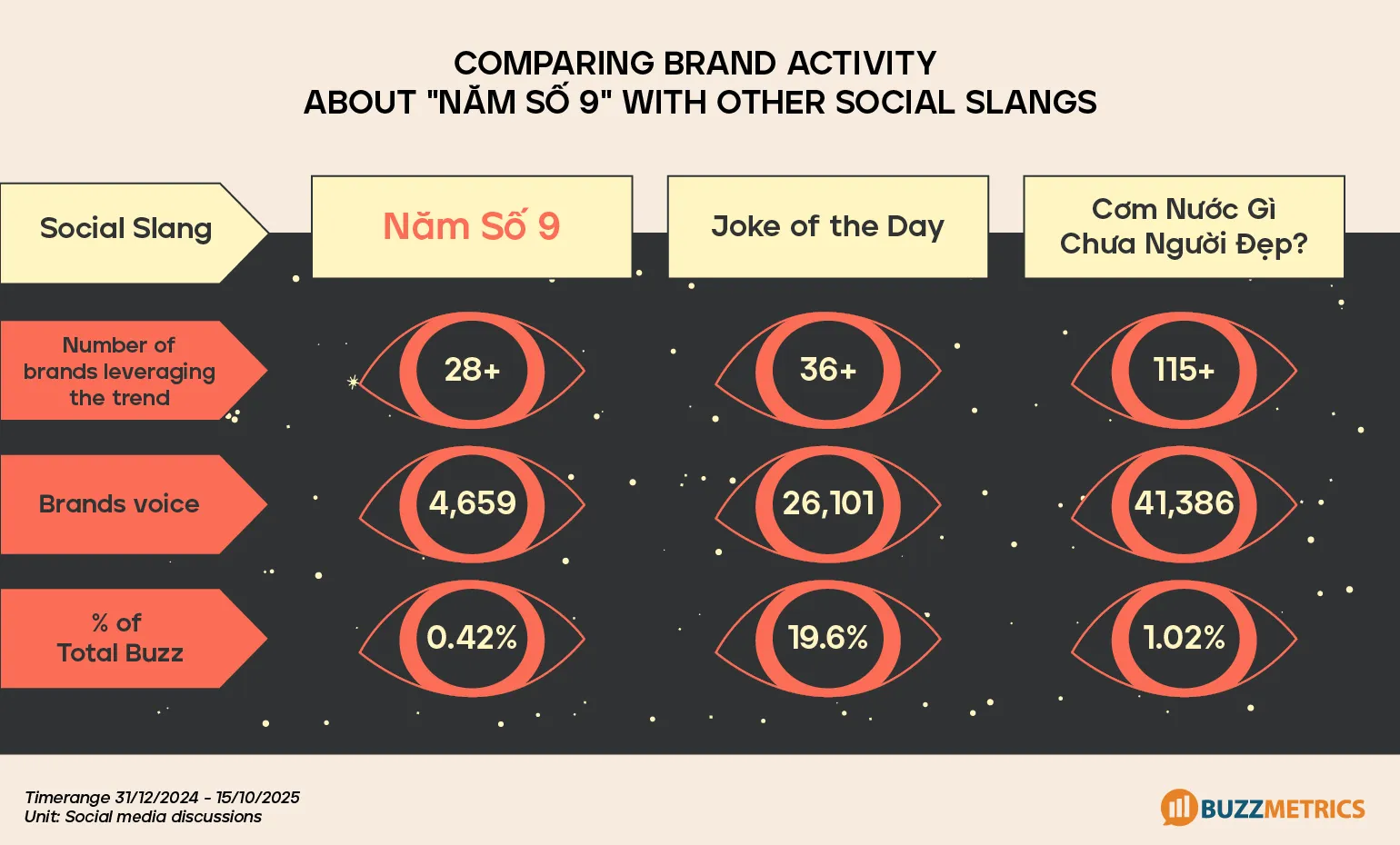Despite its massive social footprint, brand participation remains minimal—less than 0.5% of total discussions, with only around 30 brands mentioning “Năm Số 9.” These figures are relatively low compared to “Joke of the Day,” another viral social slang from early 2025 that brands leveraged actively due to its flexible usage context. Because “Năm Số 9” is tied to drama, many brands remain cautious in using it. A few brands have referenced “Năm Số 9” in a more positive sense—linking it to mental or physical cleansing—but these efforts have yet to create significant media impact.
