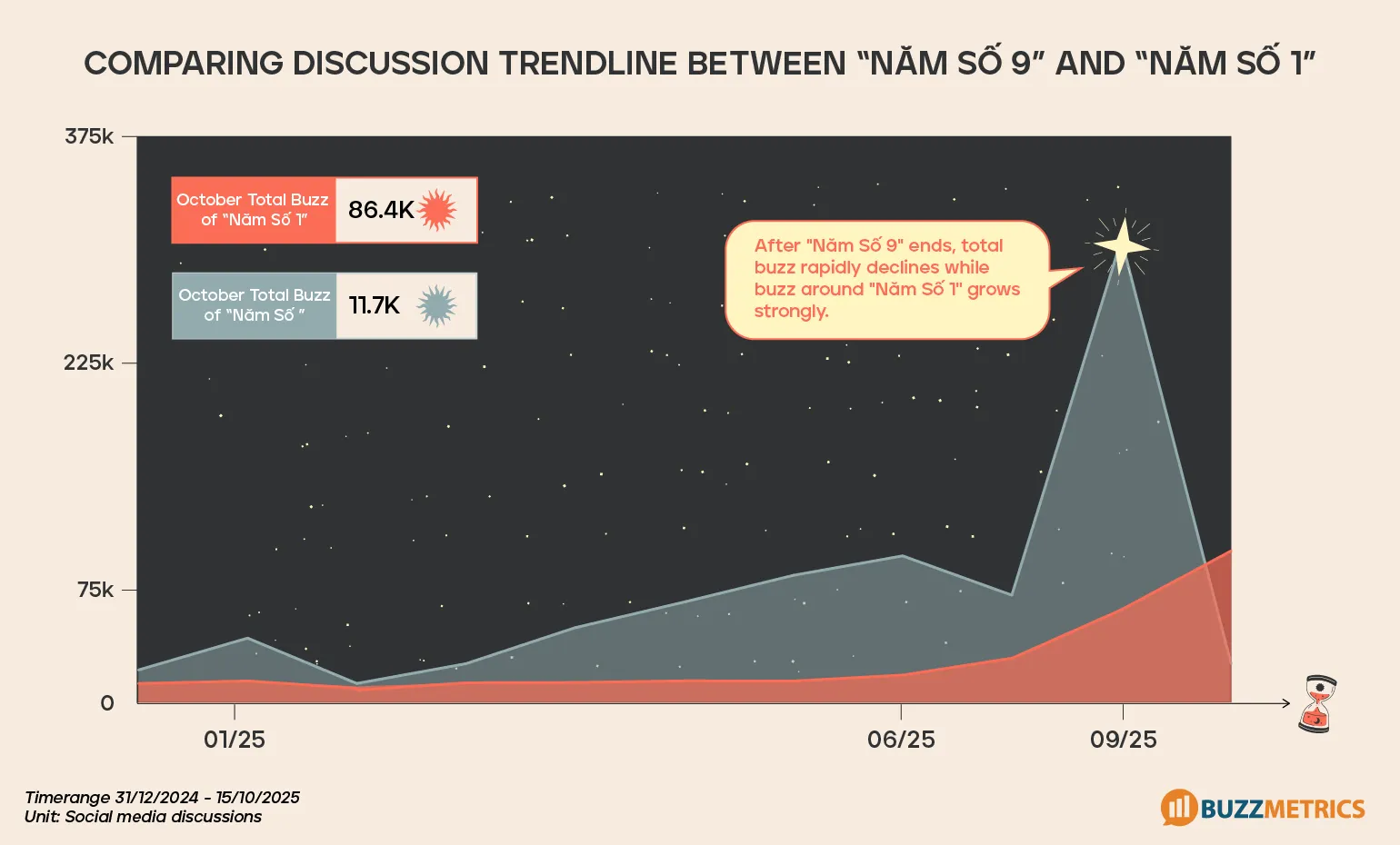 By October 2025, discussions around “Năm Số 9” began to cool down, while conversations about “Năm Số 1” (“Year of New Beginnings”) started to surge. If “Năm Số 9” represents a year of cleansing, “Năm Số 1” is seen as a year of planting seeds—symbolizing new beginnings and hope for growth. So, how does “Năm Số 1” differ in its discussion themes, and how can brands make use of it?