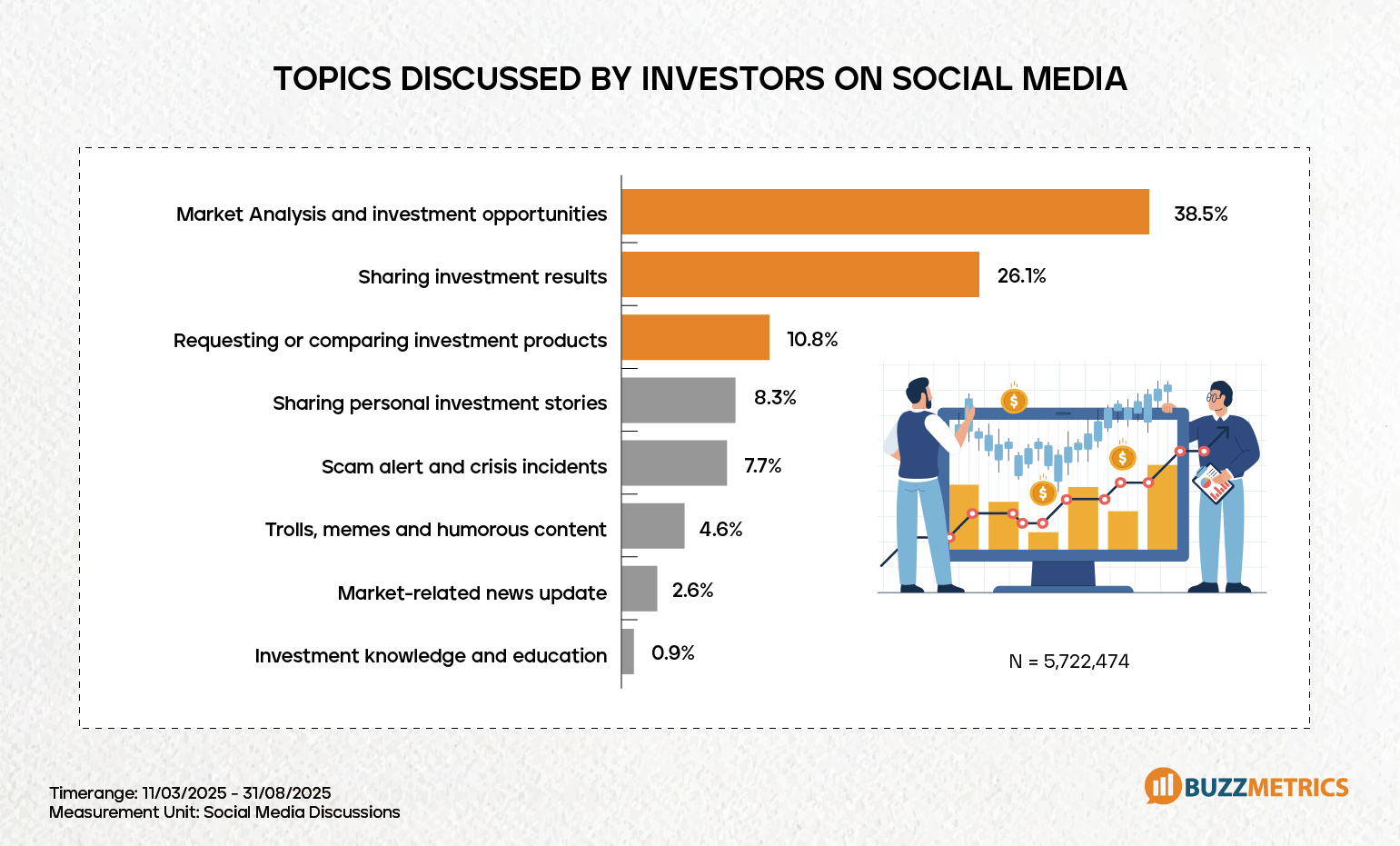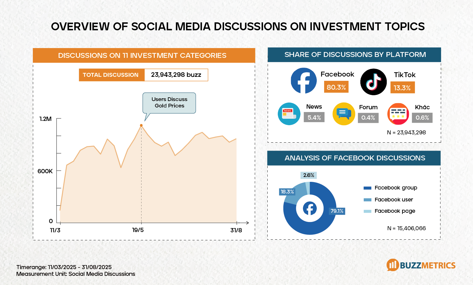 Data from Buzzmetrics shows that during the period from February 2025 to August 2025 alone, discussions surrounding 11 different investment categories generated nearly 24 million mentions on social media. Among these platforms, Facebook plays a central role as the primary discussion channel—particularly through Facebook Groups, where investment communities form and sustain deep, continuous exchanges.