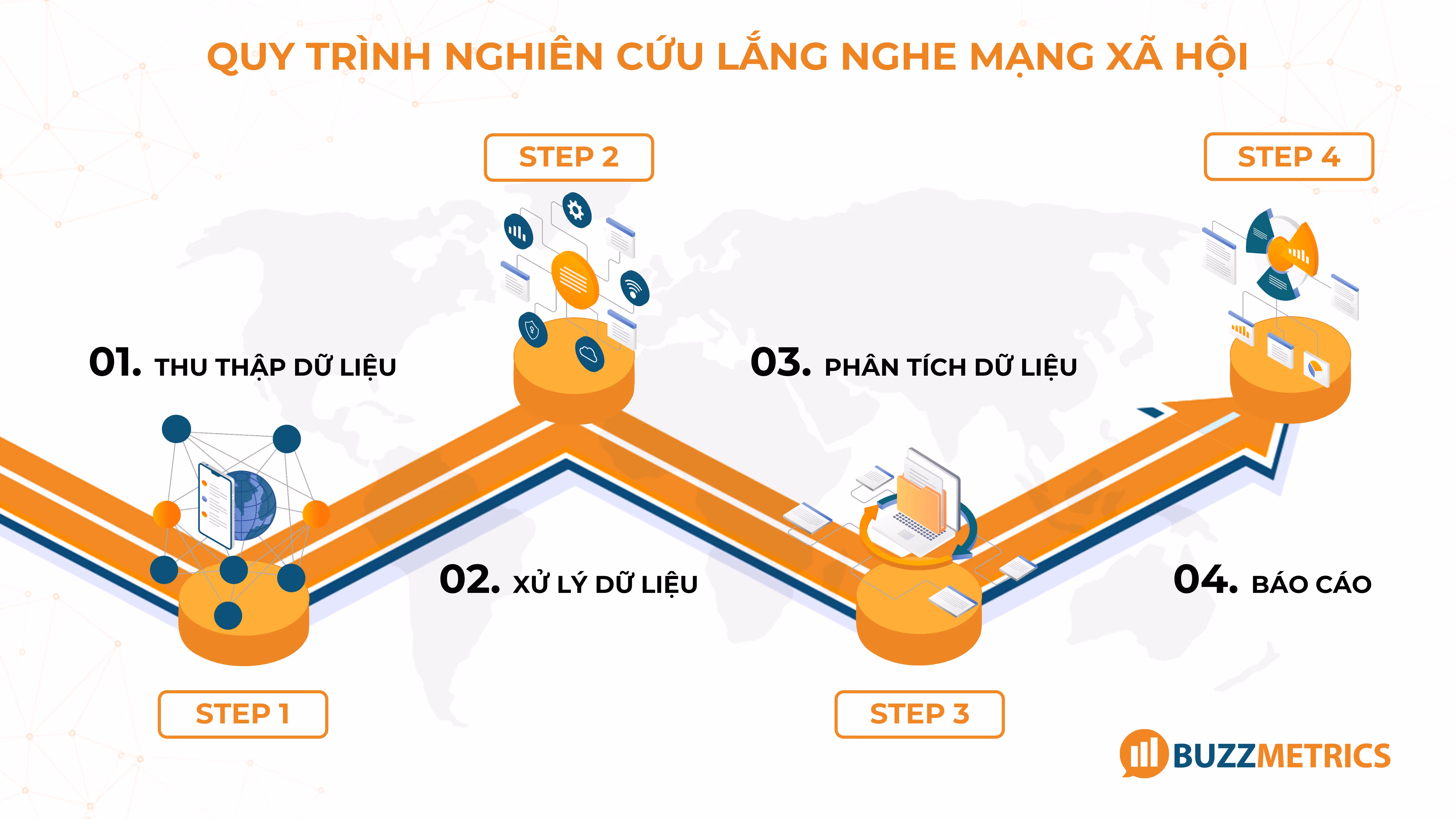 Quy trình thu thập và phân tích dữ liệu của Buzzmetrics kết hợp giữa nền tảng công nghệ Big Data và A.I. cùng đội ngũ phân tích thị trường chuyên môn cao.