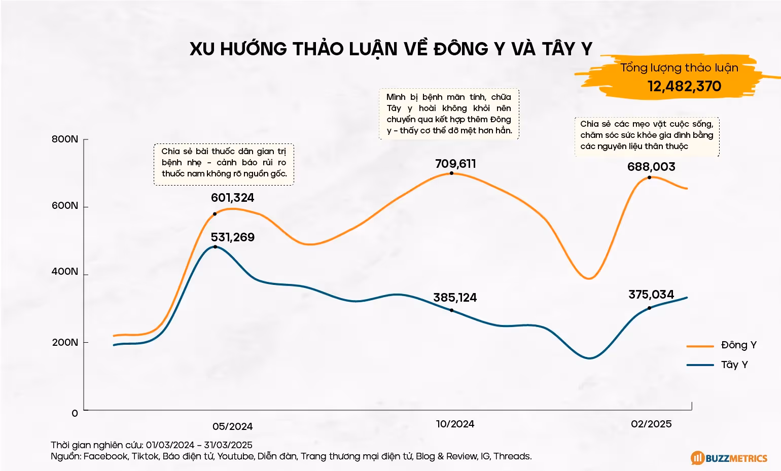 Trong quá trình nghiên cứu hành vi người dùng cho nhóm ngành hàng chăm sóc sức khỏe, Buzzmetrics nhận thấy 1 xu hướng chuyển dịch rõ ràng của người dùng, đặc biệt thể hiện rõ qua những thảo luận của ngành hàng Dược phẩm. Cụ thể, thảo luận về phương pháp điều trị bệnh bằng uống thuốc, trên mạng xã hội người dùng có sự phân biệt rõ ràng giữa các sản phẩm Đông và Tây Y, và từ dữ liệu thảo luận trong hơn 1 năm từ 03/2024-02/2025, hành vi sử dụng và mối quan tâm của họ đang có sự phân hóa và thay đổi lớn.