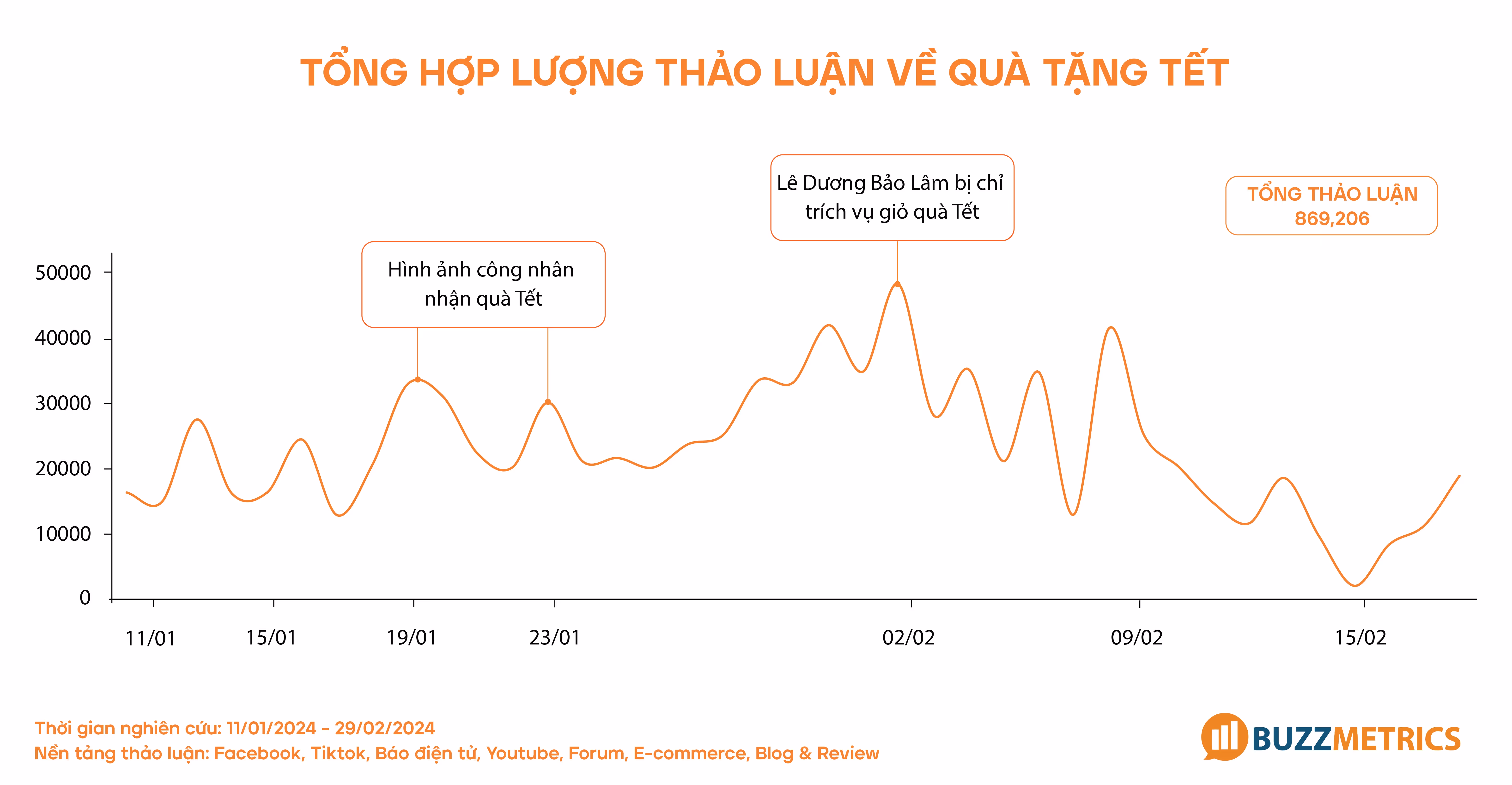 Tặng quà không chỉ là động lực chi tiêu hàng đầu dịp Tết, mà các nội dung truyền thông khai thác cảm xúc từ khoảnh khắc tặng quà cũng tạo nên những ấn tượng mạnh mẽ trên mạng xã hội. Các bài đăng chia sẻ hình ảnh trao tặng phần quà Tết cho những người công nhân cũng tạo nên nhiều đỉnh thảo luận, đặc biệt từ ngày 20 đến 27 tháng Chạp, khi các thương hiệu đẩy mạnh hoạt động truyền thông.