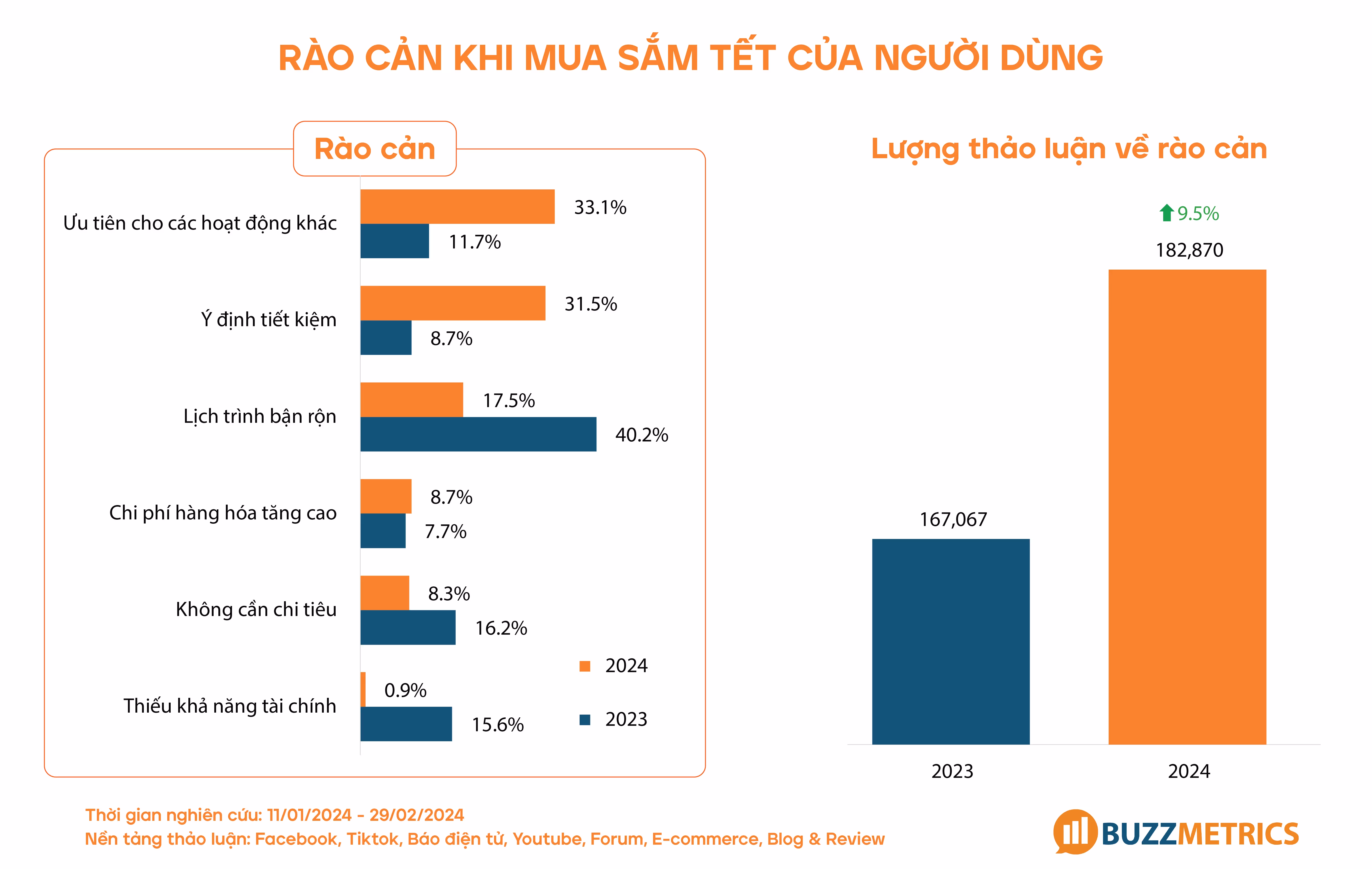 Xét về rào cản của người dùng khi chọn quà Tết, các yếu tố ngăn cản việc chi tiêu cho quà Tết năm 2024 đã gia tăng đáng kể so với năm trước, với số lượng thảo luận về rào cản tăng 9.5%, từ 167,067 thảo luận lên 182,870 thảo luận. Trong quá trình phân tích consumer voice, rào cản này chủ yếu xuất phát từ mong muốn tiết kiệm thời gian và tiền bạc để dành cho các hoạt động khác (33.1%) và tâm lý chú trọng tiết kiệm trong bối cảnh kinh tế khó khăn (31.5%).