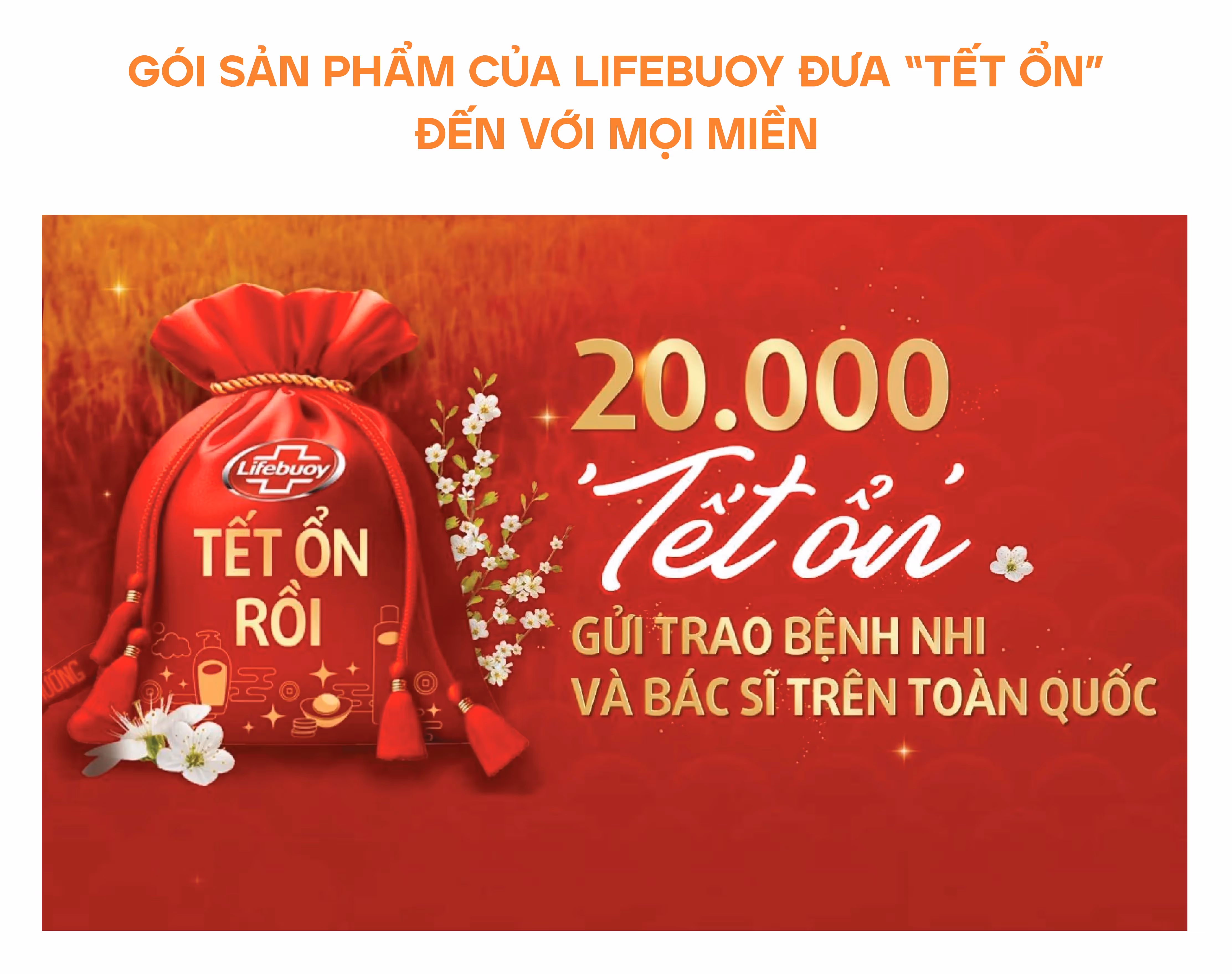Trong khuôn khổ chiến dịch, Lifebuoy tặng 20,000 phần quà sức khoẻ thể chất và tinh thần cho bệnh nhi và đội ngũ y tế tại 20 bệnh viện trên toàn quốc. Trong mỗi phần quà là bộ ba sản phẩm sữa tắm, nước rửa tay, dung dịch diệt khuẩn Lifebuoy cùng những món quà đặc trưng ngày Tết như áo dài truyền thống, bánh chưng, bao lì xì... - những món quà giản dị nhưng thể hiện sự quan tâm và tinh thần sẻ chia của nhãn hàng với y bác sĩ, người bệnh không được sum họp bên gia đình ngày xuân mới.