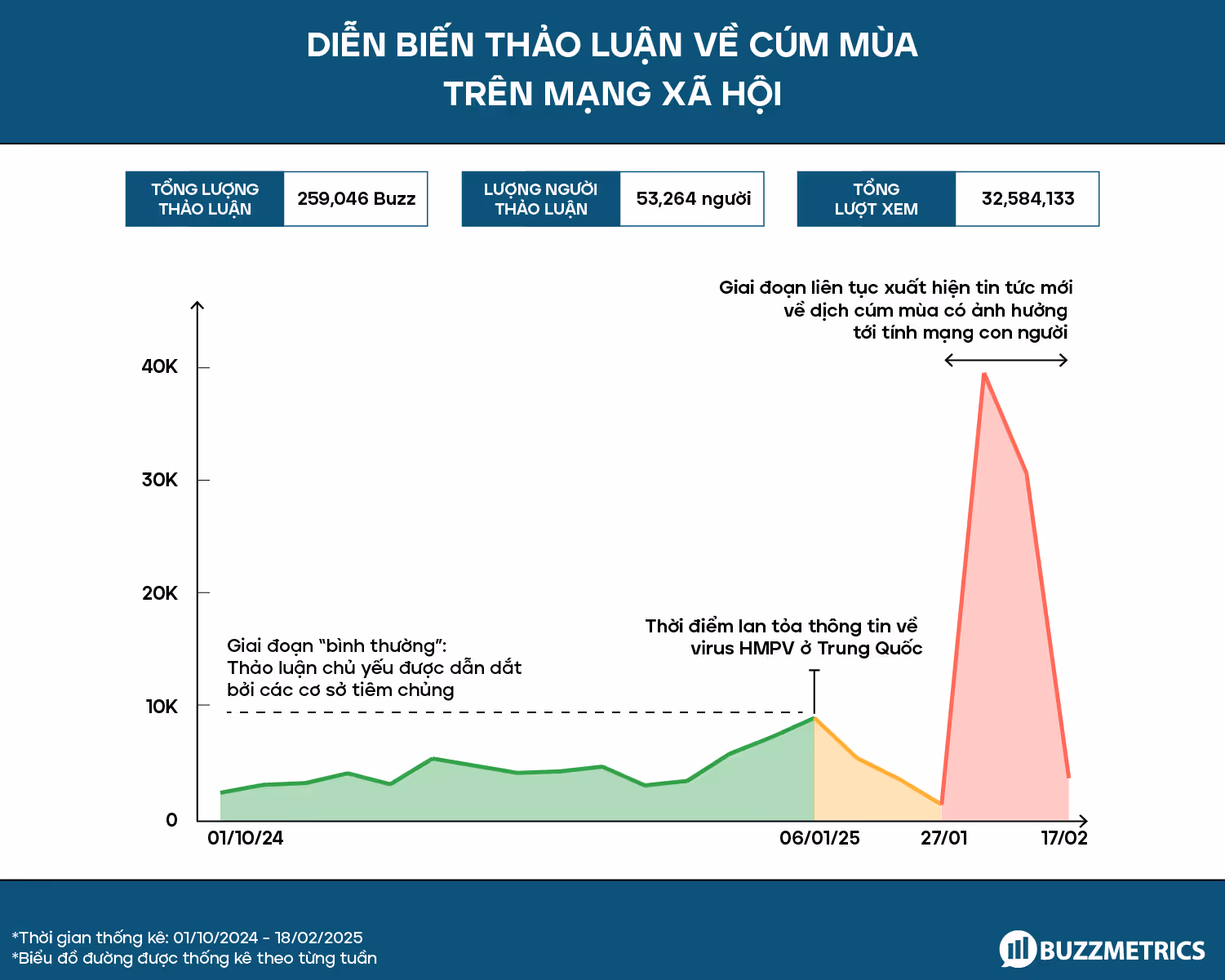 - Giai đoạn 1 ghi nhận sự tăng nhẹ trong thảo luận do lo ngại về một đợt bùng phát dịch bệnh tại Trung Quốc, gây ra bởi virus HMPV. Trước sự thiếu rõ ràng về mức độ nghiêm trọng và bản chất của dịch bệnh, người dùng đã bày tỏ sự hoang mang, lo lắng. Tuy nhiên, nhờ các thông tin xác thực từ cơ quan chức năng và giới chuyên môn, lượng thảo luận đã nhanh chóng giảm trở lại.