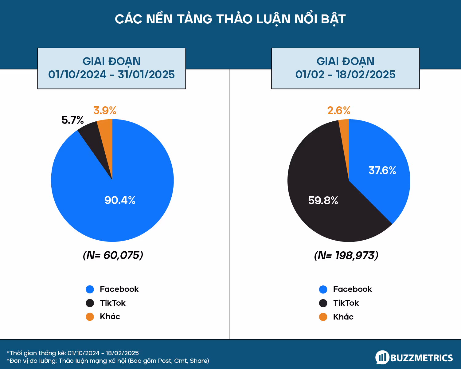 Bên cạnh biến động về nội dung, các nền tảng mạng xã hội nơi diễn ra thảo luận cũng chứng kiến sự thay đổi rõ rệt. Trong thời kỳ "thấp điểm", Facebook vẫn duy trì vị trí là nền tảng có lượng thảo luận lớn nhất. Tuy nhiên, khi bước vào "cao điểm", TikTok đã nổi lên như một điểm nóng mới, với thị phần thảo luận tăng vọt từ 5.6% lên đến 59.8%.