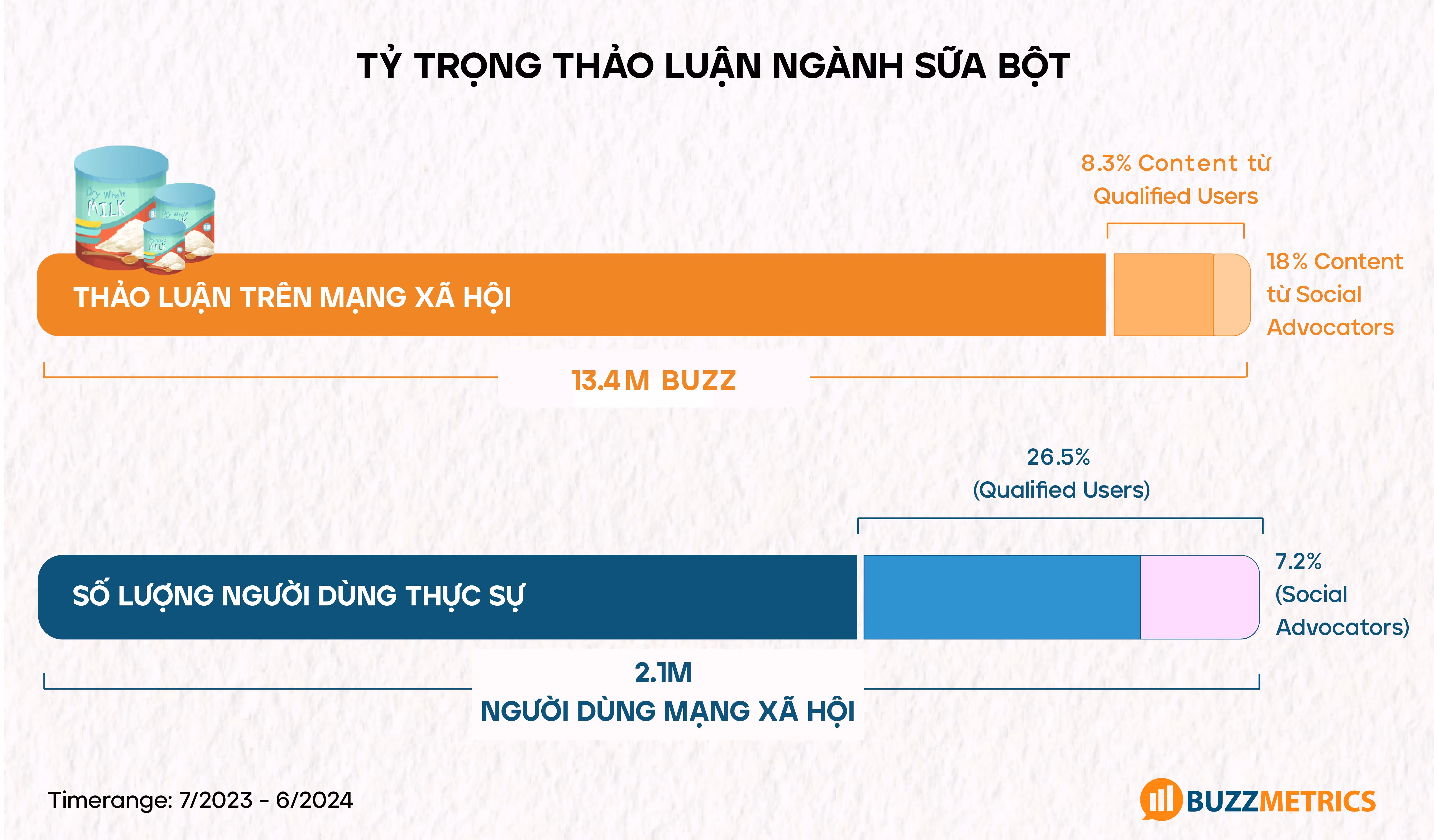 Trong giai đoạn từ 7/2023 - 6/2024, ngành sữa bột ghi nhận tới 13.4 triệu lượt thảo luận trên mạng xã hội. Tuy nhiên, phần lớn các nội dung này đến từ các tài khoản không rõ danh tính, bao gồm fanpage, group, hoặc người dùng có hành vi bất thường, chiếm tới 73.5% tổng lượng thảo luận. Chỉ 26.5% lượng thảo luận đến từ người dùng thực sự (Qualified Users) – những người có hành vi tự nhiên và có giá trị để phân tích insight.