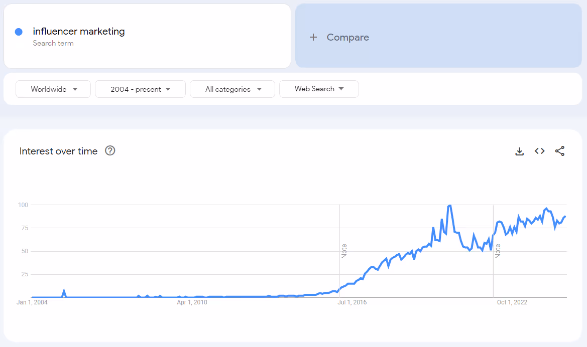 Ngày nay, khi niềm tin người tiêu dùng trở thành chìa khóa thành công cho thương hiệu, thì việc tự giới thiệu sản phẩm đến người tiêu dùng là chưa đủ. Và đó chính là lý do khiến cho Influencer Marketing được xem như là một xu hướng mới của ngành truyền thông - quảng cáo. Theo report từ Grand View Research, quy mô thị trường Influencer Marketing toàn cầu ước tính đạt 25.44 tỷ đô la Mỹ vào năm 2024 và dự kiến đạt 34.25 tỷ đô la Mỹ vào năm 2025. Lên Google Trends và gõ cụm từ "Influencer Marketing" bạn có thể thấy sự tăng trưởng không hề nhỏ.